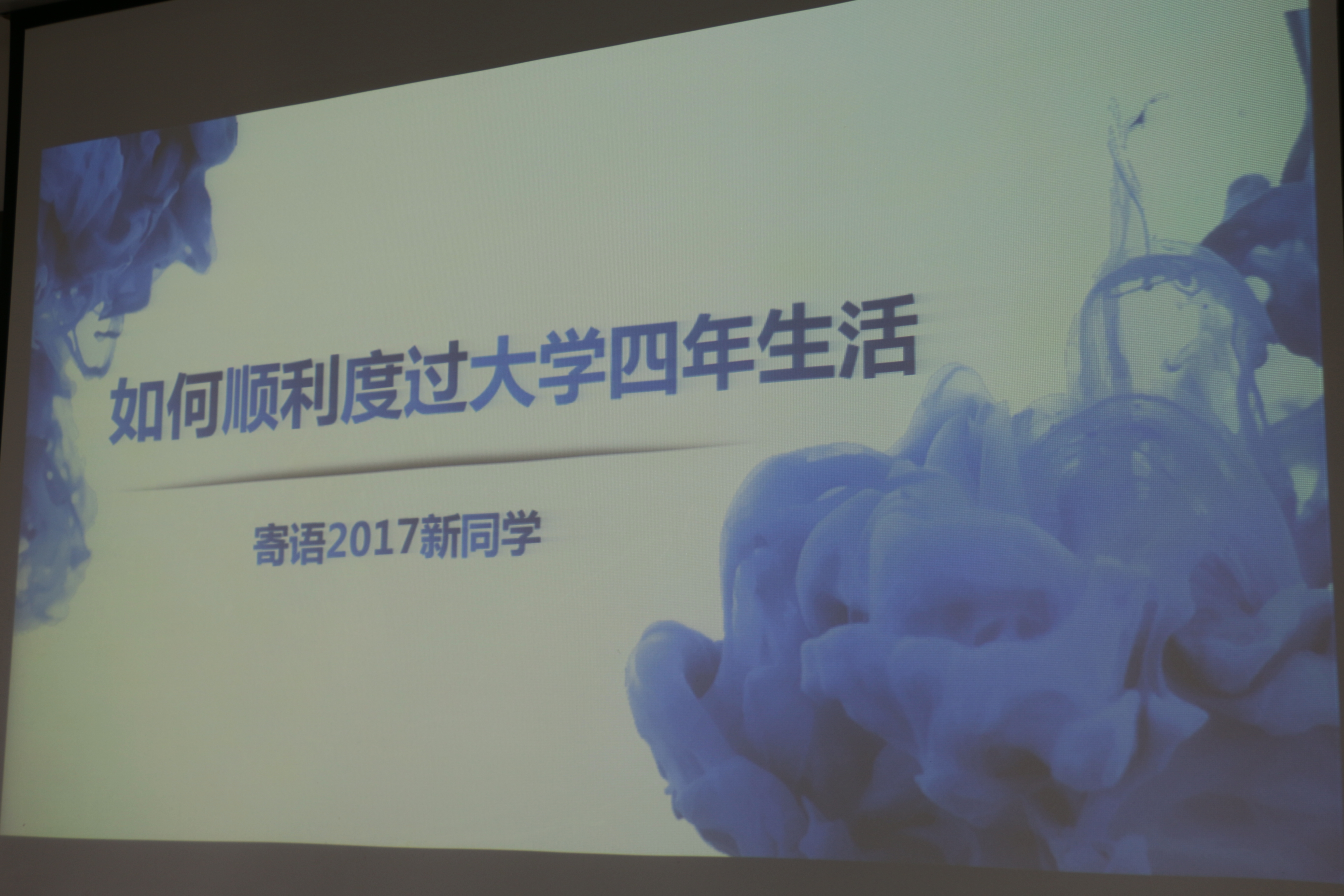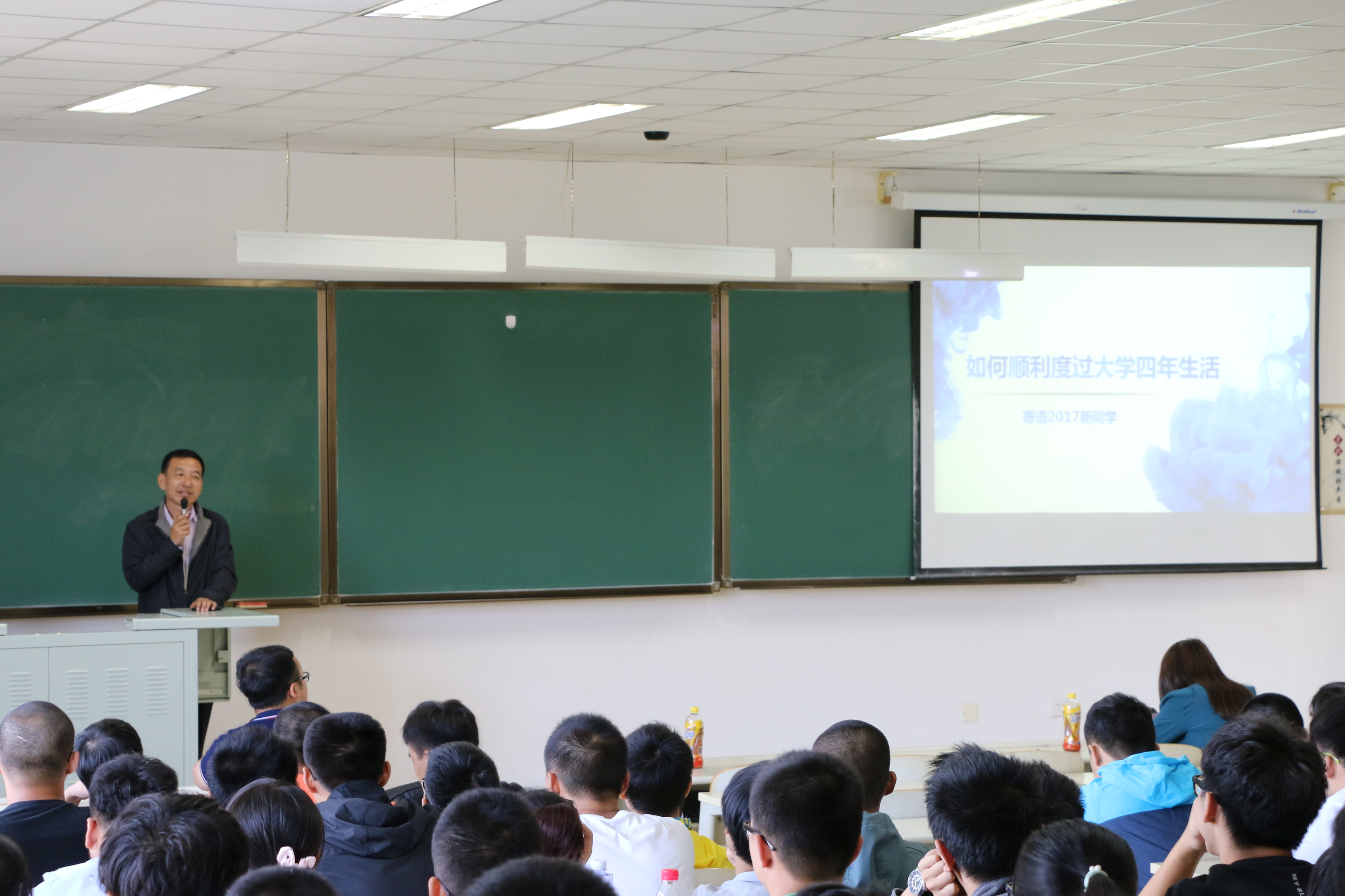讲座伊始,王书记首先为新生展望了一下四年后可能的五个结局——毕业、考研、出国、淘汰、不能正常毕业。论及原因,王书记讲到大学是一场长跑,这四年时光,有的人一开始就踏上了其他跑道,也有人挤到了前面的队伍,是时间让大家变得不一样。之后王书记又以毕业季中沉睡的老员工为切入点列举了大学期间部分老员工自理能力不强、没有自主学习能力荒废时间的现象。同时又以现在的学费和生活费算下来每一天的花销在60元以上来激励员工不要浪费时间也不浪费父母的金钱。随后王书记又列出了大学期间必须要做的几件事,为大一新生的大学之路指引了方向,同时也强调了良好习惯的重要性。最后,王爱民书记讲到,“用知识改变命运,用勤奋播撒希望,用激情创造价值,用实力创造未来”,借此表达了对2017级新生的勉励,也对新生表示了极大的期许。