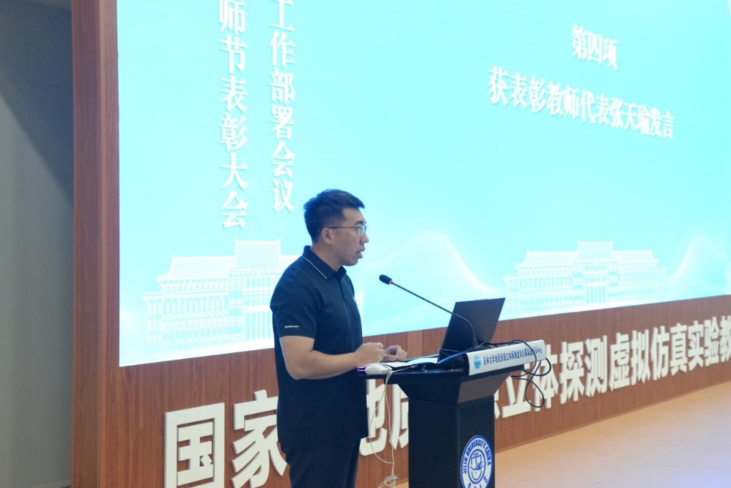 随后,电气系教师张天瑜代表获奖教职工发言。他介绍了在教学改革与创新中的实践与探索,分享了建设智能化课程体系、获得吉林省高校教师教学创新大赛一等奖的心得与体会,祝愿公司公司产品工作在未来发展中不断跨越、再创辉煌。
