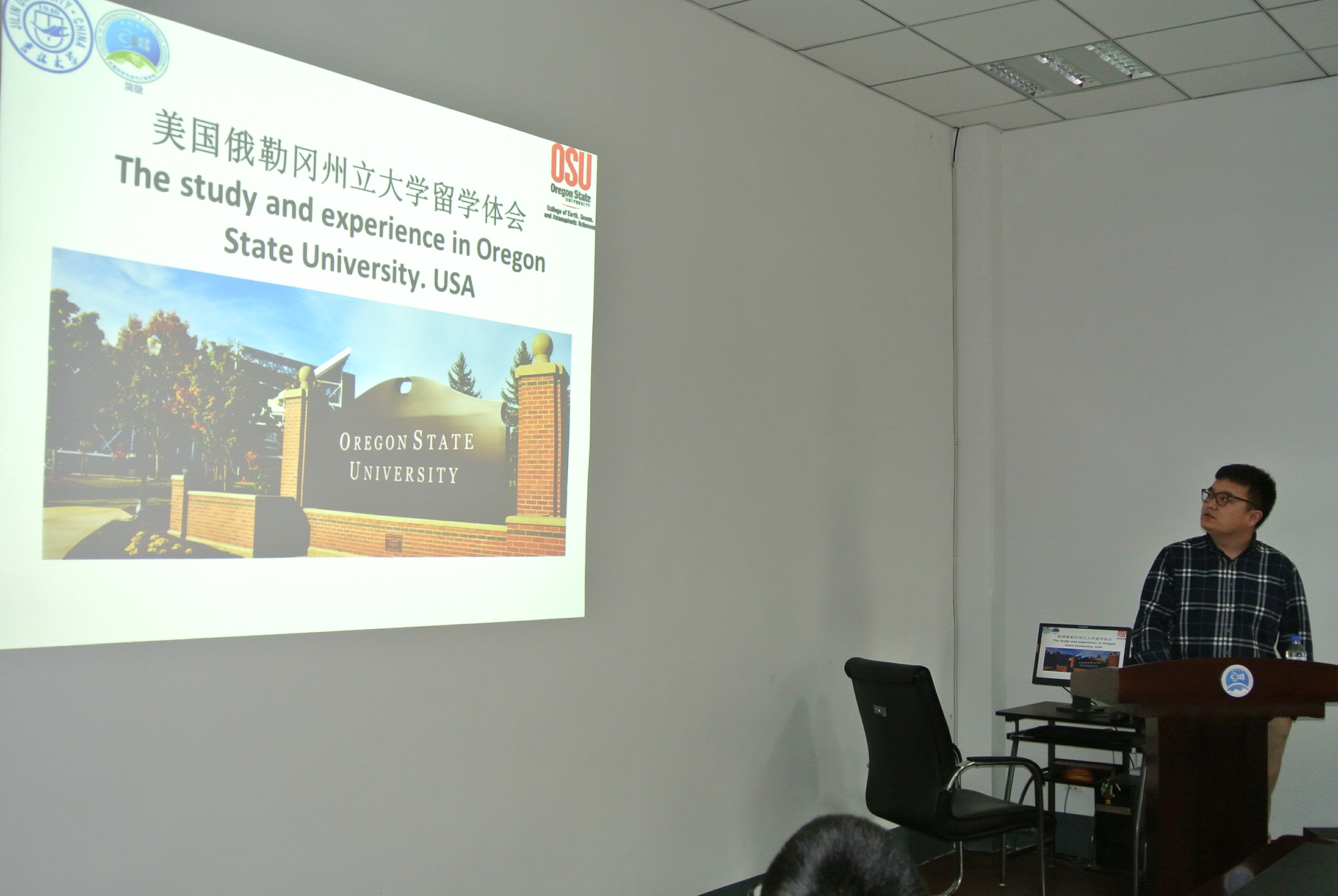 suncitygroup太阳成集团与美国俄勒冈州立大学联合培养的博士呼彦朴就《波场变换技术基本原理与FD-FWD方法研究》做了报告,他汇报了这两年在美国所进行的科研成果,并与现场的同学们交流了自己的留学的经历和体会。着重地说明了出国前的准备过程,包括外语考试,选择院校,联系导师,办理签证等等一系列事宜,旨在为选择留学的同学提供一些经验和便利。