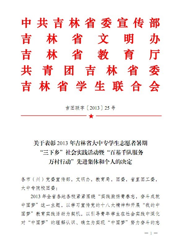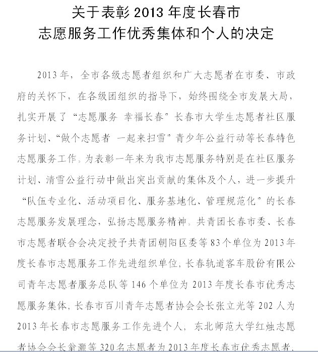 在中共吉林省委宣传部、吉林省文明办、吉林省教育厅、共青团吉林省委、吉林省员工联合会联合下发的《关于表彰2013年吉林省大中专员工志愿者暑期“三下乡”社会实践活动暨“百基千队服务万村行动”先进集体和个人的决定》中,suncitygroup太阳成集团志愿服务小分队获得吉林省“百基千队服务万村行动”先进团队(共52个),院团委书记朱宇获得吉林省暑期“三下乡” 社会实践活动暨“百基千队服务万村行动”先进个人(共104名);在共青团长春市委下发《关于表彰2013年度全市共青团工作先进集体和优秀个人的决定》中,suncitygroup太阳成集团团委被评为“长春市先进(基层)团委”,院团委书记朱宇被评为“优秀基层团干部”;在共青团长春市委、长春市志愿者联合会下发的《关于表彰2013年度长春市志愿服务工作优秀集体和个人的决定》中,suncitygroup太阳成集团团委、“牵手”青年志愿者协会被评选为2013年度长春市优秀志愿服务集体。此外,公司党委副书记兼副经理邱增凯、院团委书记朱宇还被公司推荐为2013年度吉林省优秀志愿者。