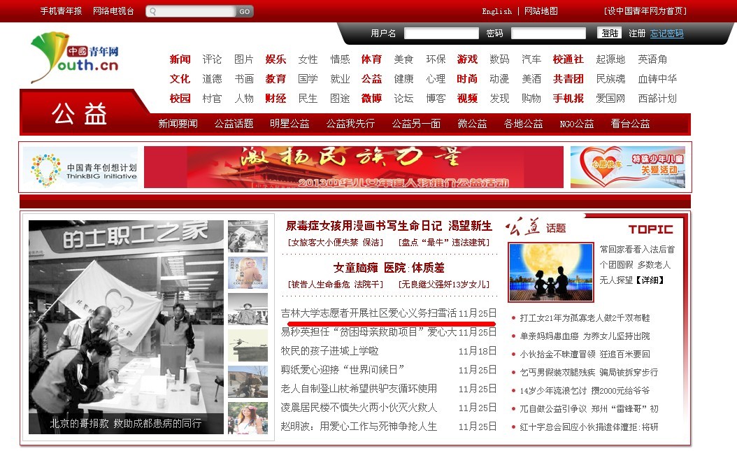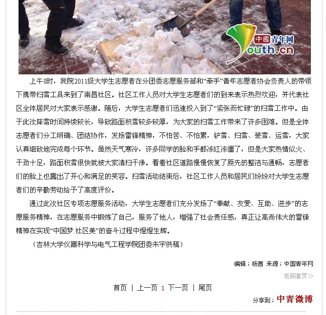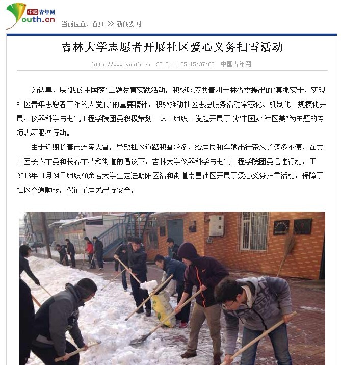 中国青年网《suncitygroup太阳成集团志愿者开展社区爱心义务扫雪活动》