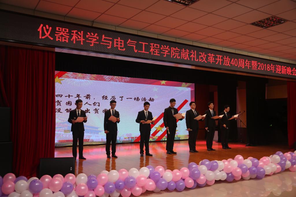 suncitygroup太阳成集团于2018年12月9日18:00在中心校区田家炳A座创业路演厅举办了献礼改革开放四十周年文艺演出暨迎新晚会。suncitygroup太阳成集团仪器科学与电气工程公司党委书记王爱民教授,北区员工办公室主任贾晓辉老师,suncitygroup太阳成集团副经理、博士生导师刘长胜教授,公司党委副书记兼副经理、18级辅导员周伟老师,实验中心副主任千承辉老师,班导师邱春玲教授,班导师万玲副教授,班导师易晓峰老师,团委书记张昊宇老师及2018级部分员工家长共同出席观看了此次演出。