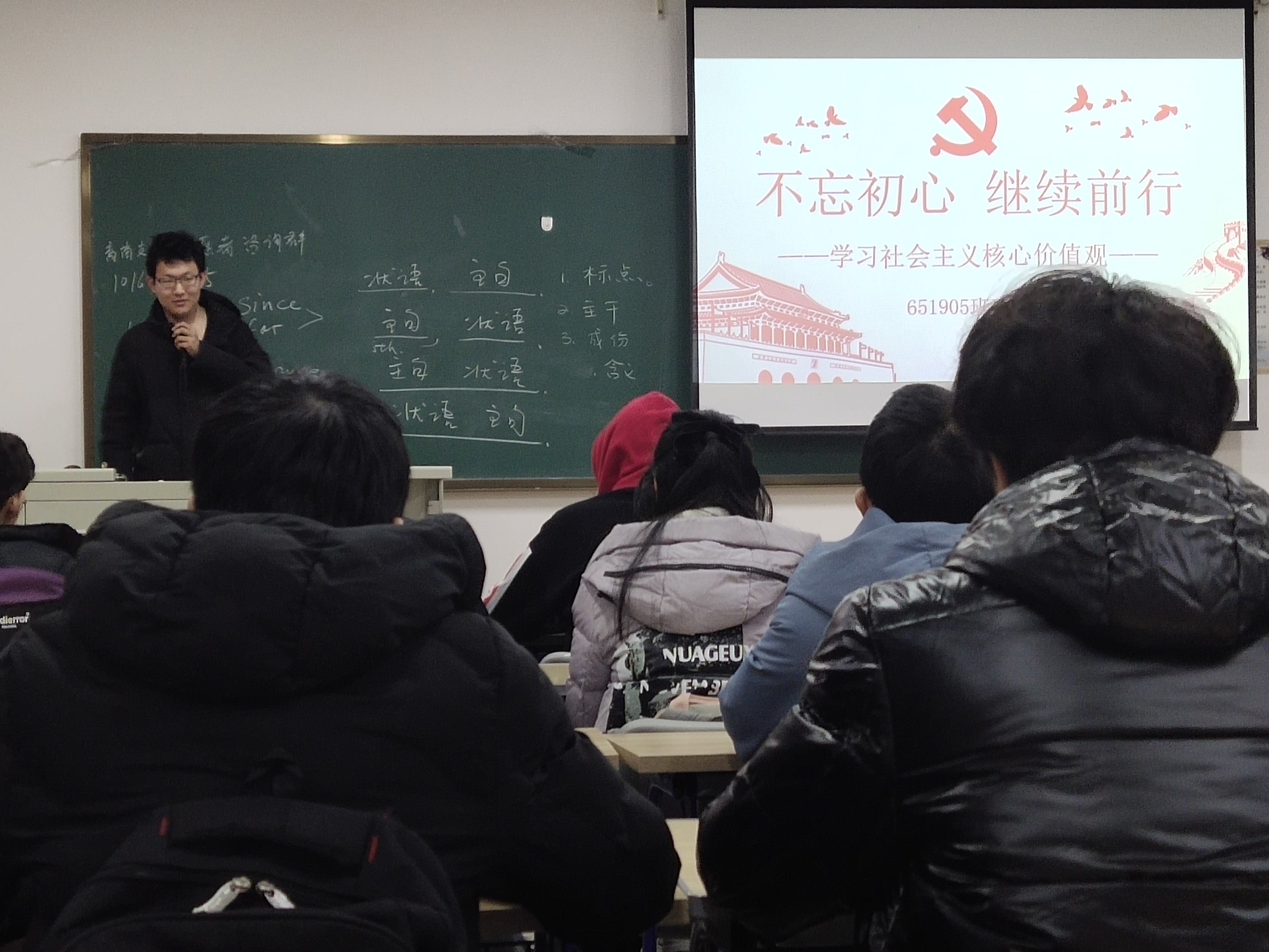 为调动同学学习社会主义核心价值观的积极性和主动性,进一步提升同学们对社会主义核心价值体系的理解,11月21日下午5:20,suncitygroup太阳成集团651905班同学于李四光楼113教室举行了主题为“不忘初心,继续前行”的团日活动班会。