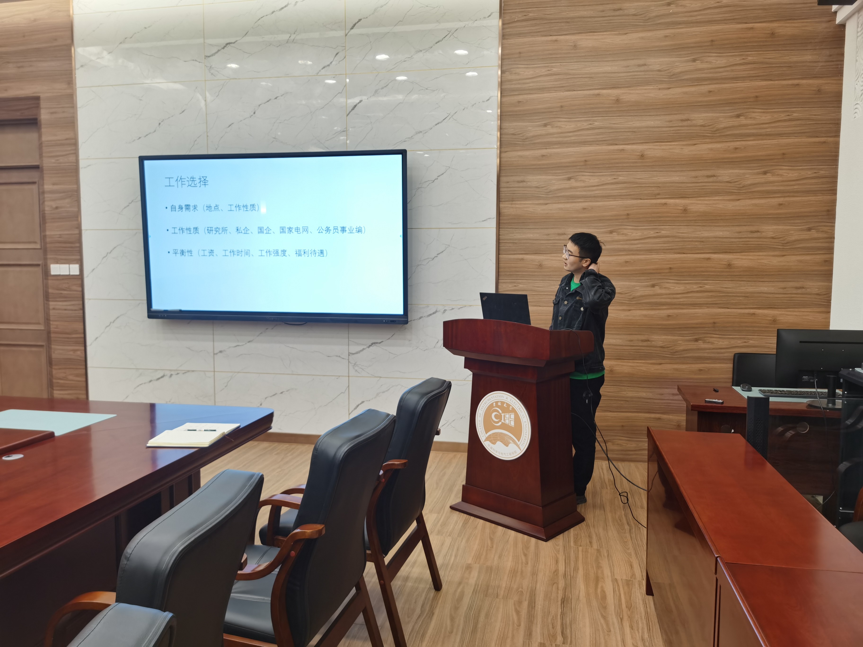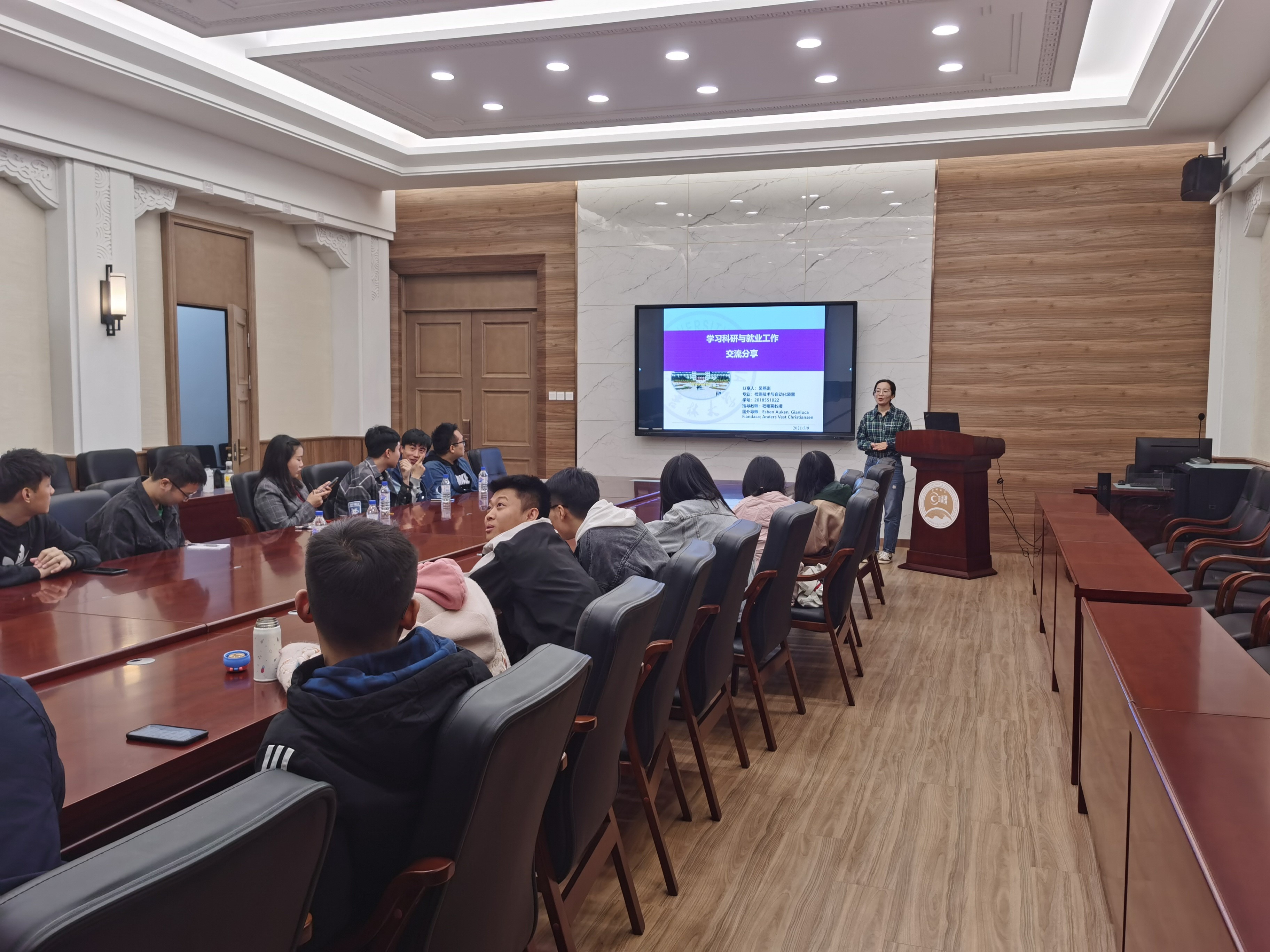 讲座伊始,主持人简明介绍了本次讲座的主题,提出了研究生做好自身规划对学术发展的重要影响,在大家的热烈的掌声中,本次交流会正式开始。受邀前来分享经验的5名同学在主持人的引导下依次上台讲话。吴燕琪博士分享了在奥胡斯大学的求学经历,并详细为大家讲解了在科研及出国留学的具体经验;邵晶雅为大家分享了自己疫情期间的学习经历,并为大家分享了如何关注求职信息、如何投递简历方面的经验;张春锋、刘乃嘉和张明维均结合自己的求职与科研经历,鼓励大家在参与科研项目时要深入了解其中的原理,并为大家分享了在面试、笔试环节的经验技巧。上台演讲的几位毕业生同学在会前都做了认真的准备,均准备了精心制作的PPT,他们丰富的经验满足了同学们的各种毕业打算,也丰富了同学们对未来的认知。会议最后,上台演讲的同学纷纷留下了自己的联系方式,告诉同学们如果有任何关于科研就业的问题都可以咨询他们。与会者们再一次用热烈的掌声表示着对他们的感谢和钦佩,相信本次交流会一定使与会者收益良多。