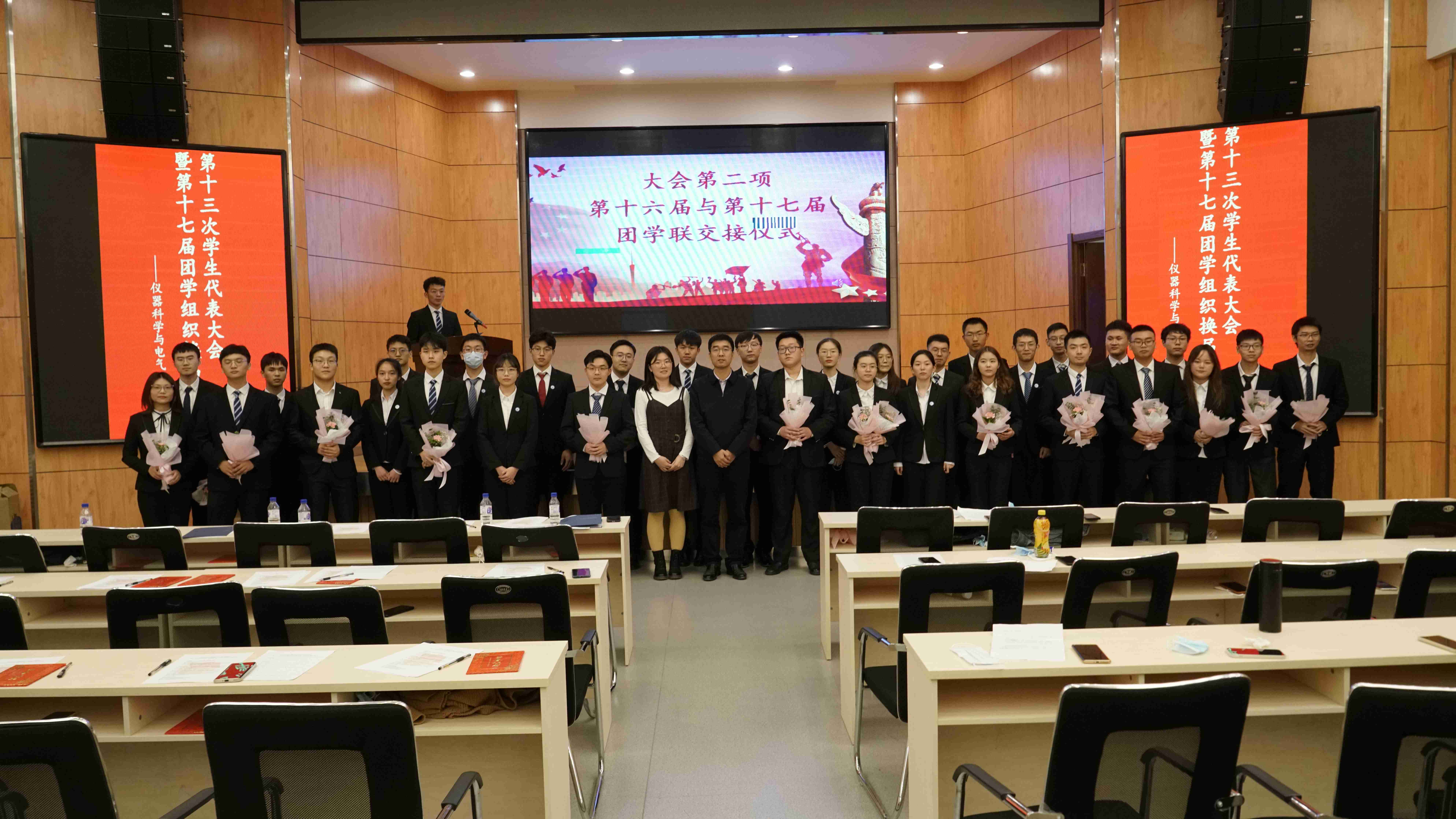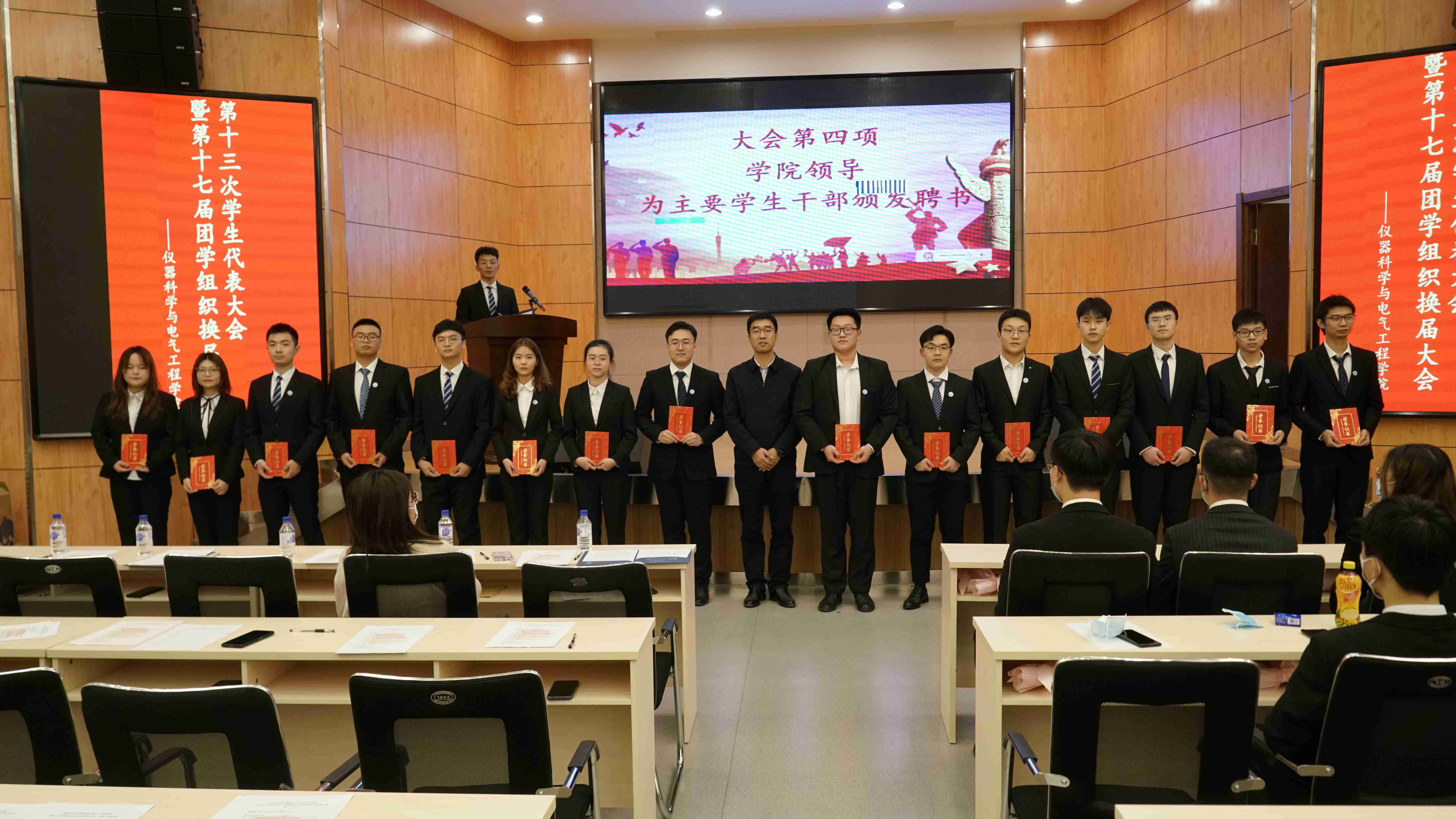 大会认定2019级郝毅同学当选第十七届分团委副书记,王鑫宇同学当选员工会执行主席,赵晓慧同学、赵梦珂同学当选员工会主席,大会还选举产生了分团委、员工会、新闻媒体社、社团联合会各部门负责人。随后,大会进行了团学联交接仪式,十六届团学联组织成员将承载着责任的徽章郑重地交到学弟学妹手中。2020级周逸凡同学作为优秀志愿者代表发言,他表示在今后的员工工作中,一定履行团学组织成员职责,兢兢业业为同学们服务,为公司的发展贡献自己的一份力量。