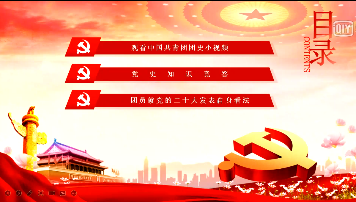 会议伊始,大家一起观看了与中国共青团团史党史相关的视频。然后,徐春雨同学主持开展了党史知识答题环节,同学们积极参与,回答准确,展现了扎实的知识储备。接下来,于越、刘志铭、王颢潼和张家维等同学积极就党的二十大发表了自身看法和心得感悟。最后,辅导员孙鹏博老师对本次团日活动进行点评。