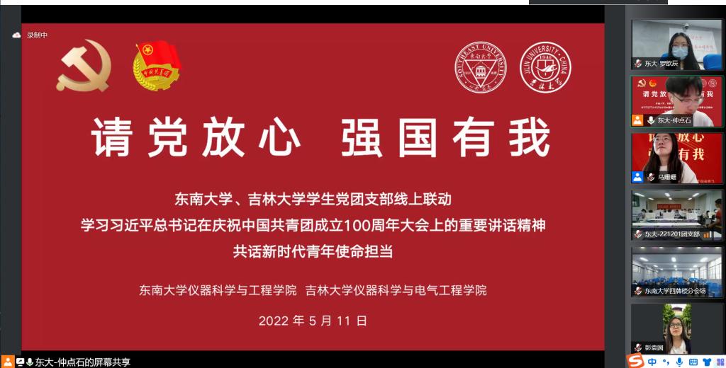 2022年5月11日下午,东南大学与suncitygroup太阳成集团联合开展的“请党放心,强国有我” 党团支部共建活动在腾讯会议线上举行,来自suncitygroup太阳成集团和东南大学的青年师生参与其中。东南大学仪器科学与工程公司团委书记彭袁圆老师,学办主任仲点石老师,公司团委副书记马姗姗老师,电气本科生党支部书记孙鹏博老师出席本次活动。