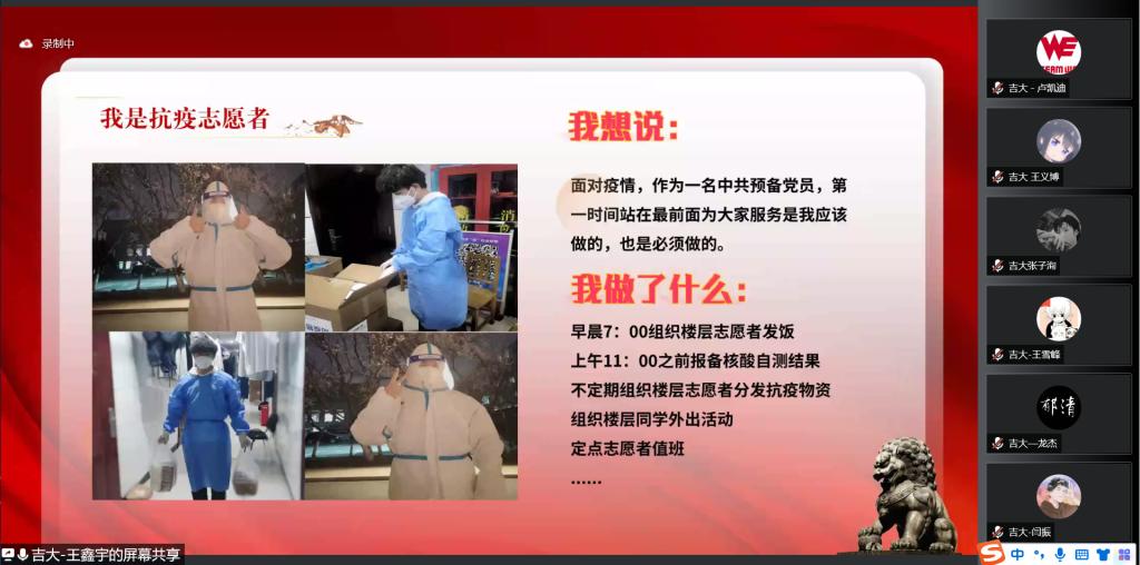 会议开始,东南大学彭袁圆老师对suncitygroup太阳成集团的支持表示感谢,向与会同学们致以亲切的问候。随后在东南大学仲点石老师的带领下,与会成员共同学习习近平总书记在庆祝中国共产主义青年团成立100周年大会上的重要讲话精神,激励同学们增强勇担时代重任的光荣感、责任感、使命感,号召同学们汲取智慧、提振信心,为实现中华民族伟大复兴中国梦贡献力量。深入学习习近平总书记的重要讲话后,公司抗疫志愿者代表分享广大师生在抗疫过程中的先进事迹和宝贵经验。郝毅、王鑫宇、赵梦珂、胡玮桐同学分别从个人和集体两个角度出发,分享了在校园封闭管理期间的抗疫日记和志愿服务经历,吉大学子守望相助、封校不停学,员工党员积极投身防疫一线,践行着新时代青年的初心与使命。听完suncitygroup太阳成集团同学的分享,东南大学党团支部员工代表分享他们的抗疫事迹。精彩的发言与分享让与会的同学们再一次感受到了战“疫”之下青年人的奋斗与担当。围绕会议主题,参会同学展开了热烈的讨论,员工代表纷纷表示中国共青团成立100周年是历史性的一刻,青年一辈是时代的见证者,也是时代的参与者,要牢记使命,努力奋斗,回报祖国。