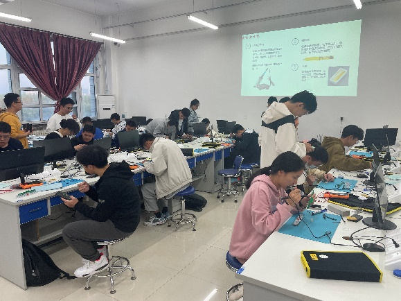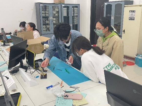 带着期待的心情,参与同学来到现场签到并陆续就座,志愿者为大家分发工具包、PCB电路板和电子元器件。活动伊始,主讲人王靖妍为大家介绍了电烙铁、焊锡等焊接工具的使用方式,以及焊接PCB电路板的技巧和注意事项,还为与会同学示范了分发部件的放置位置和组装方法。在志愿者的协助下,参与同学开始了动手操作,设计图案、焊接二极管、焊接其余元件、模型组装……志愿者随时为有疑问的同学答疑解惑,并记录下精彩的活动瞬间。装上电池的一刻,同学们的作品顺利完成,大家捧着自己亲手制作的模型合影留念,脸上洋溢着骄傲和自豪。