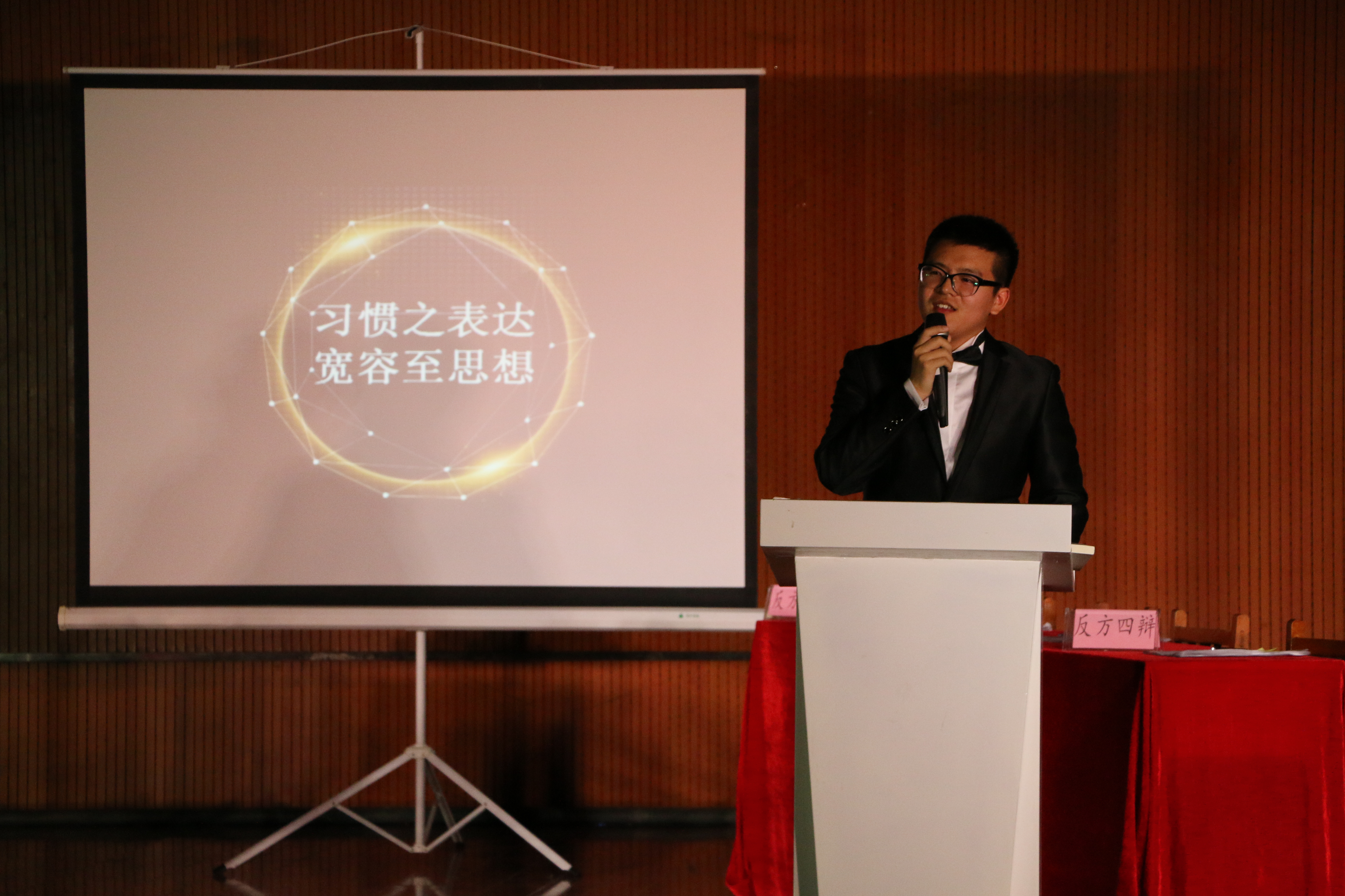 18时30分,报告厅的灯光突然暗下,全场的目光聚焦在舞台上。晚会由公司生声论坛成员自主设计的宣讲视频开始。六分钟精彩的宣传视频生动有趣的向大家逐层渗透了生声“责任、思考、表达、分享”的核心理念。热烈的掌声中,生声论坛的员工创始人公司15级1班马松辰同学带着一句经典的“风声雨声读书声,声声入耳;家事国事天下事,事事关心”登上演讲台。配合简洁明了的幻灯片,他用生动的语言,丰富的例子向大家依次讲述了“广博之阅读,深邃至灵魂;焦虑之思考,自由至信仰;习惯之表达,宽容至思想;无限之分享,人文至创意;豁达之尝试,恪慎至责任”的社团拓展理念,倡导当今老员工广泛阅读,多思考,多交流,明确自己的责任与担当,同时也用肺腑之言表达了自己和团队创立社团一路走来的心路历程。最后,马松辰同学引用雅思贝尔斯在《什么是教育》中的一段话:“精神贵族是从各阶层中产生的,其本质特征是品德高尚、个体精神的永不衰竭和才华横溢,因此精神贵族只能是少数人,大学的观念应指向这少数人,而芸芸众生则在对精神贵族的憧憬中看到了自身的价值。”作为宣讲的结束。