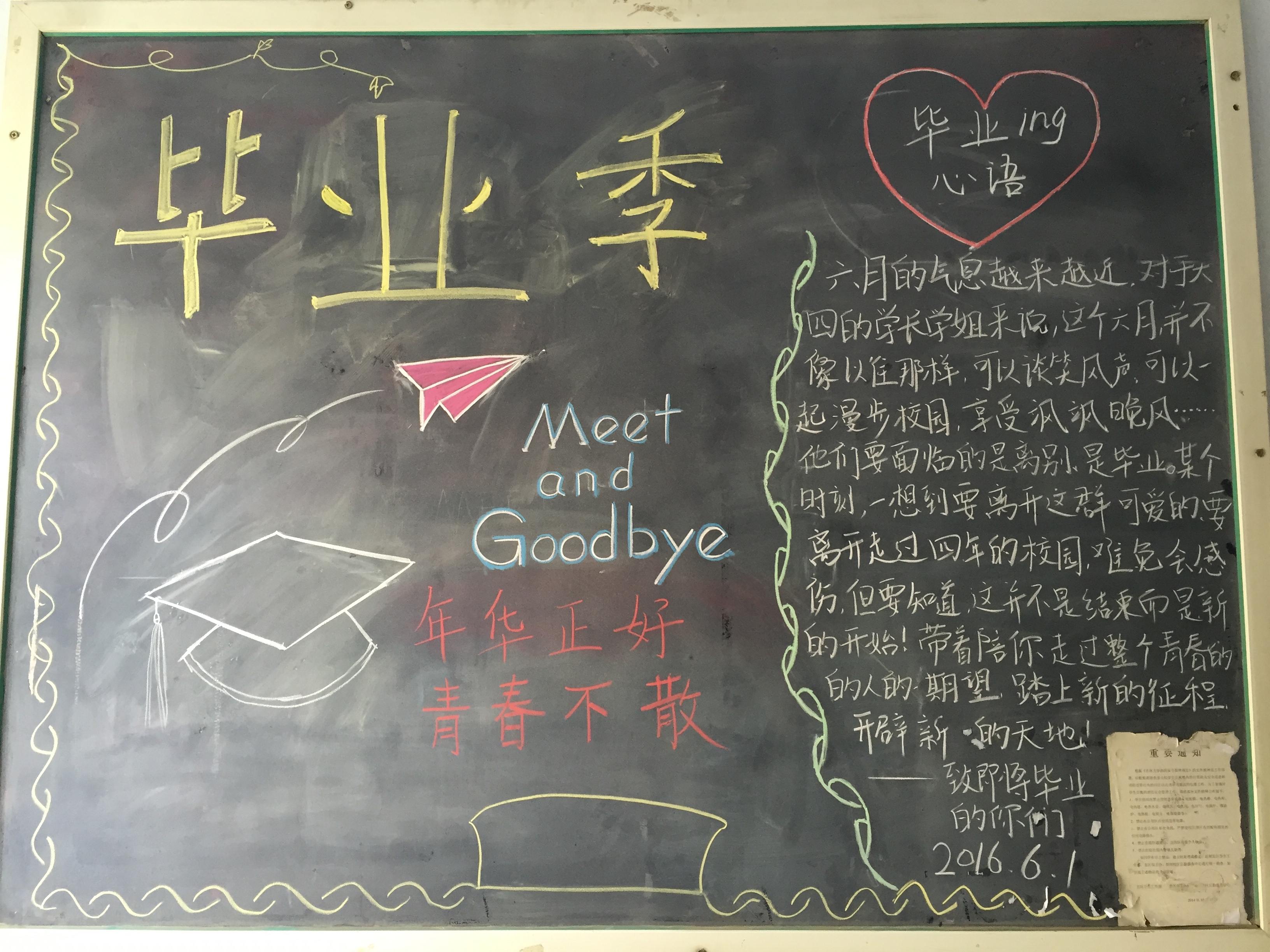 “毕业季”黑板报美化了公寓环境,加强了校园文化建设,表达了学弟学妹们对即将毕业同学们的真切祝福,也抒发了毕业同学们对校园的热爱与不舍。相信即将毕业的同学们能在未来的学习生活中再接再厉,创造出属于自己的辉煌!(suncitygroup太阳成集团团委新闻通讯社 撰稿)