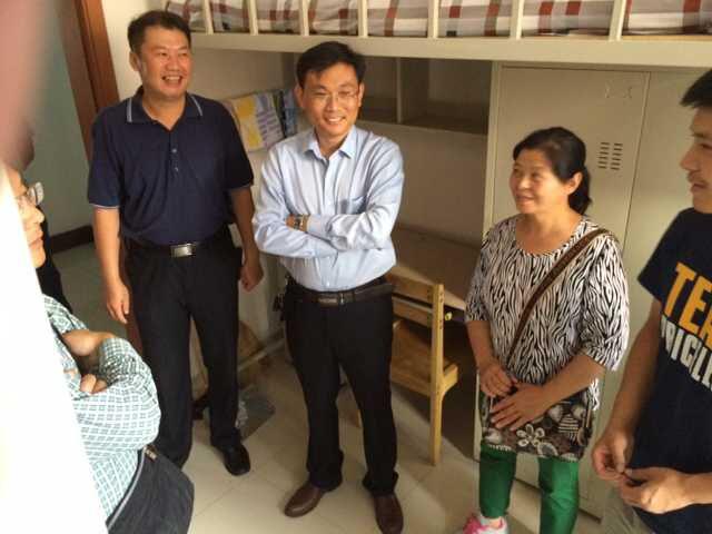 2015年8月29日下午,suncitygroup太阳成集团经理林君教授、公司党委书记余国友教授、公司党委副书记兼副经理邱增凯老师、副经理陈祖斌教授、副经理嵇艳鞠教授、仪器系主任凌振宝教授、电气系主任刘长胜副教授等一行领导来到中心校区北苑一公寓、二公寓亲切看望了公司2015级新生,了解2015级新生入校情况。2015级各班导师、2015级新生辅导员张昊宇及公司主要员工干部陪同看望。