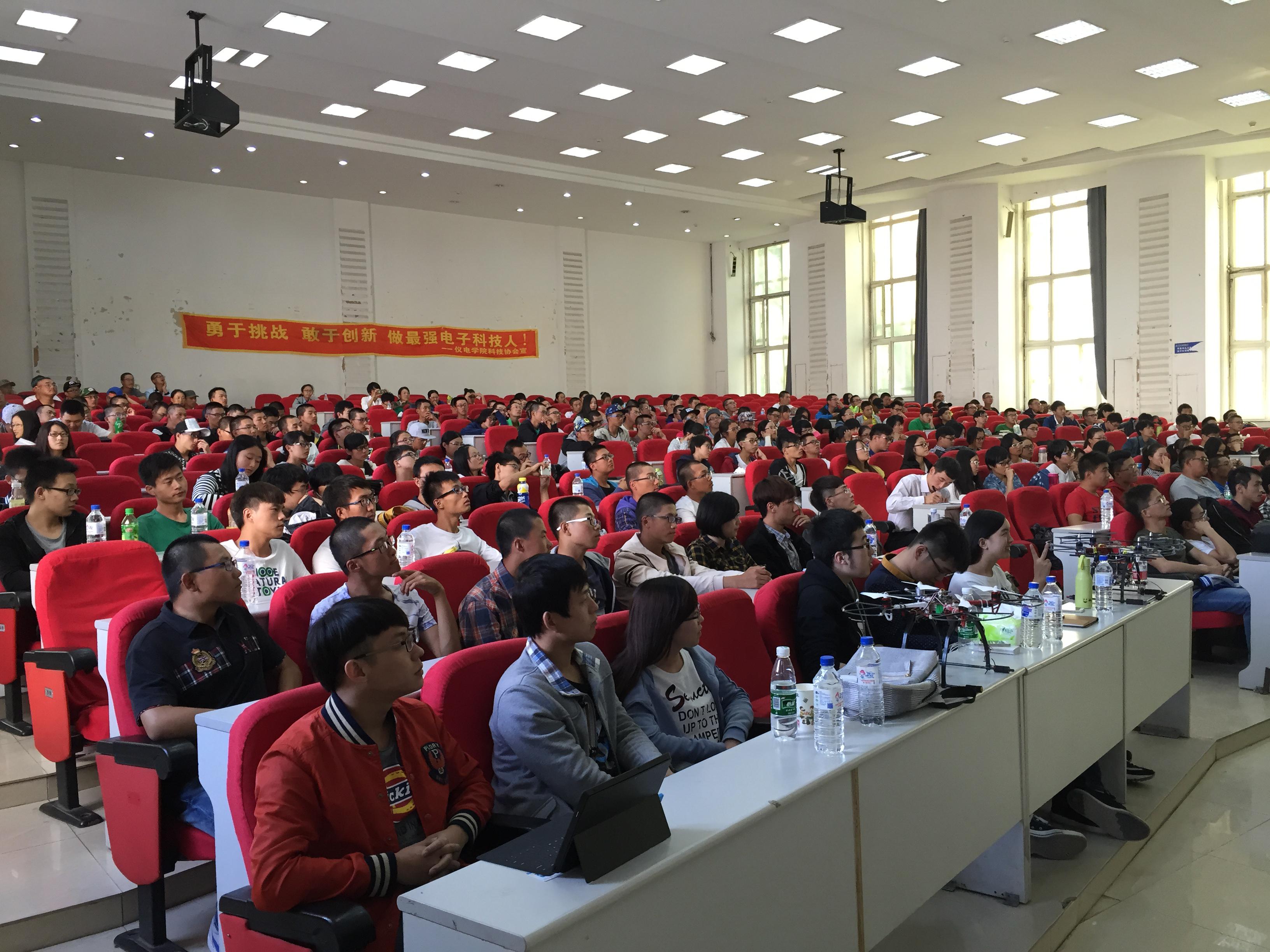 大会一开始,千老师用精心准备的PPT讲述了自己主办216+实验室的主管理念,阐述的216+实验室的活动精神以及主要培养目标。同时,她也向在座的各位观众展示了实验室的三大优势,即广阔的平台、公平竞争的机制、无限的潜力。她用生动形象的描述激起了场下众多同学的热情与兴趣。接着,2012级即将离开的216+实验室成员用丰硕的成果作品将巡讲会带入高潮。控制组的机械臂、飞机组的四旋翼飞行器,模电组的数字万能表,除了实物展示,12级的实验室成员用图片、视频给在场的每一位观众留下了深刻的影响。此外,每一个组的组员还向在场的观众讲述了自己在216+实验室的亲身经历,分享了自己获得巨大成就背后的苦与乐。短短的几十分钟,讲台上似乎演绎着12级实验室成员们过去几年的艰辛和努力,有付出就会有回报——在刚刚过去不久的国赛中,216+实验室硕果累累。然而对于已经步入大四的他们来说,216+实验室已经成为他们的过去,他们需要把实验室留给下一届的成员,为这些学弟学妹们提供一个更高、更好的平台。春去秋来,一代接着一代,只有更好,没有最好,这便是216+实验室的精神。