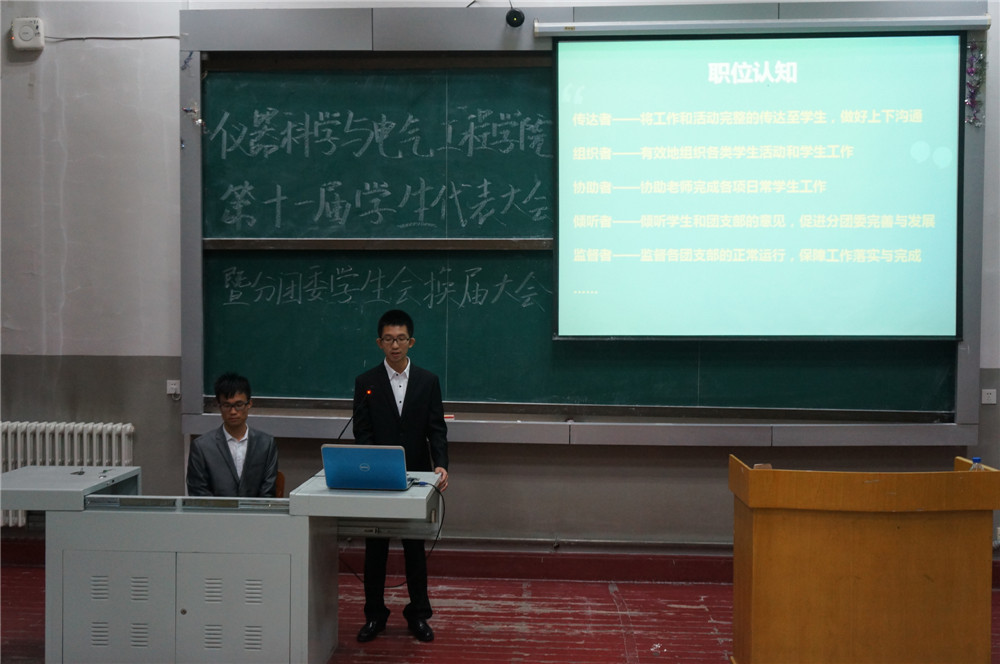 为完善公司团学组织建设,提升团学组织服务能力,推进公司共青团工作取得跨越性进展,suncitygroup太阳成集团suncitygroup太阳成集团第十一次员工代表大会暨团学组织换届大会于2015年9月28日18:30在朝阳校区地质宫224室隆重召开。仪器科学与电气工程公司党委副书记兼副经理邱增凯老师、院员工工作办公室主任兼2014级辅导员王冕老师、院团委书记兼2012级辅导员蔡印老师、2015级新生辅导员张昊宇老师出席大会,第十届分团委、员工会、各员工组织主要员工干部及各年级员工代表参加了本次大会,大会由员工会心理部部长王楠同学主持。