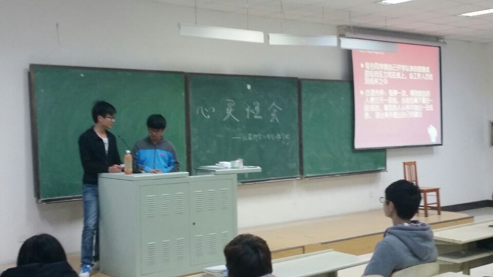 会上,首先是抽签抢答环节,同学们拿到陌生人的心理问题,通过自己的分析,为台下的观众答疑解惑。之后是心理知识大披露环节,主持人提出一些生活中不太受人关注的问题,同学们积极讨论,都给出了令人满意的答案。随后是FBI心理测试环节,看似平淡无奇的题目,却反映出一个人的性格、爱好甚至是未来的事业走向,让同学们更清楚地了解自己。随后,同学们又对日常生活中会遇到的心理问题展开了热烈讨论,气氛十分活跃。最后,大家以合影留念结束了本次心灵班会。