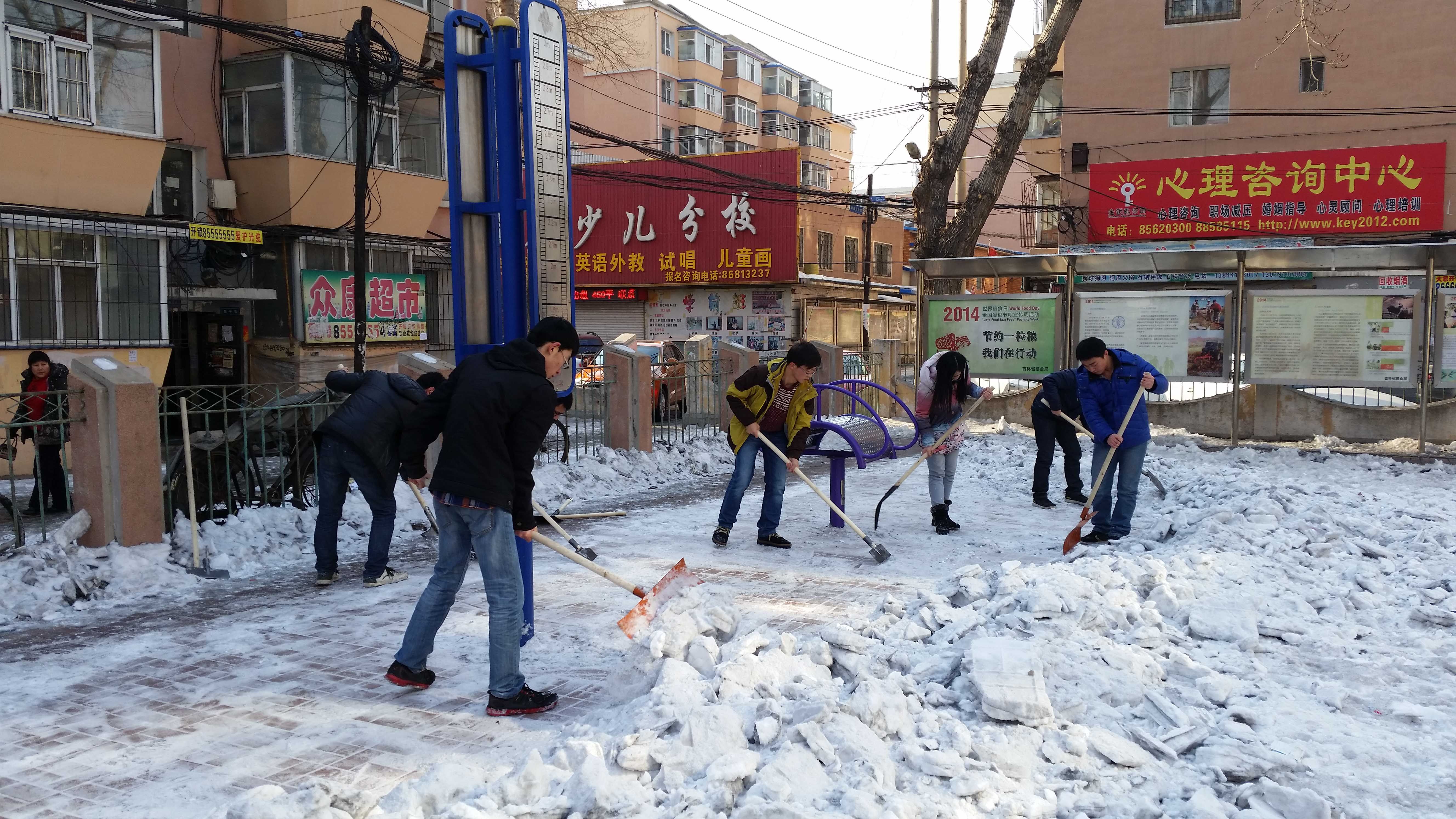 为深入贯彻落实习近平总书记系列重要讲话精神和李克强总理致公司白求恩志愿者回信精神,进一步弘扬雷锋精神和“奉献、友爱、互助、进步”的志愿者精神,组织引导广大青年员工在深入社会、了解国情、接受锻炼的过程中培育和践行社会主义核心价值观,让志愿服务成为每个吉大人的生活方式,让志愿者成为suncitygroup太阳成集团最响亮的名片,2015年3月5日下午,suncitygroup太阳成集团团委“牵手”青年志愿者协会志愿者在指导教师张昊宇的带领下走进朝阳区清和街道南昌社区开展义务除雪除冰活动。