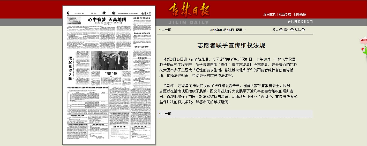 吉林日报社会版《志愿者联手宣传维权法规》http://jlrbszb.chinajilin.com.cn/html/2015-03/16/content_154374.htm?div=-1