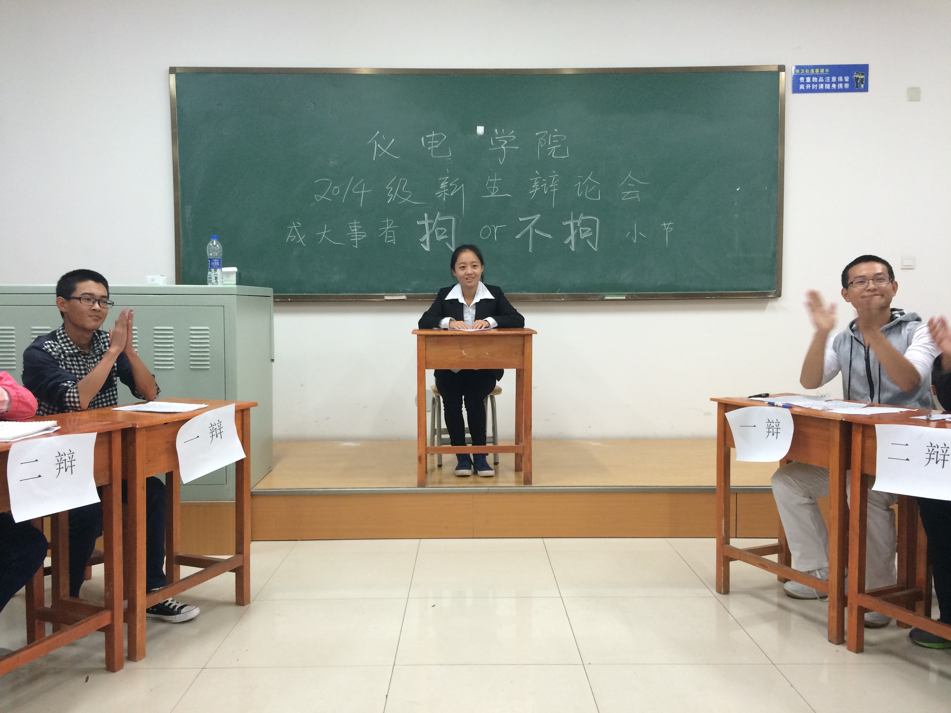 为丰富校园文化生活,提升青年员工思辨能力和语言表达能力,选拔培养优秀人才并积极备战suncitygroup太阳成集团第二十四届“先锋论坛”辩论赛,由suncitygroup太阳成集团员工会举办的“Power Speaking新生辩论赛”第二轮最后一场比赛于2014年10月21日晚在李四光318教室举行。本场比赛由“Power Speaking”协会成员担任评委及主持人,辩题为“成大事者拘or不拘小节”。