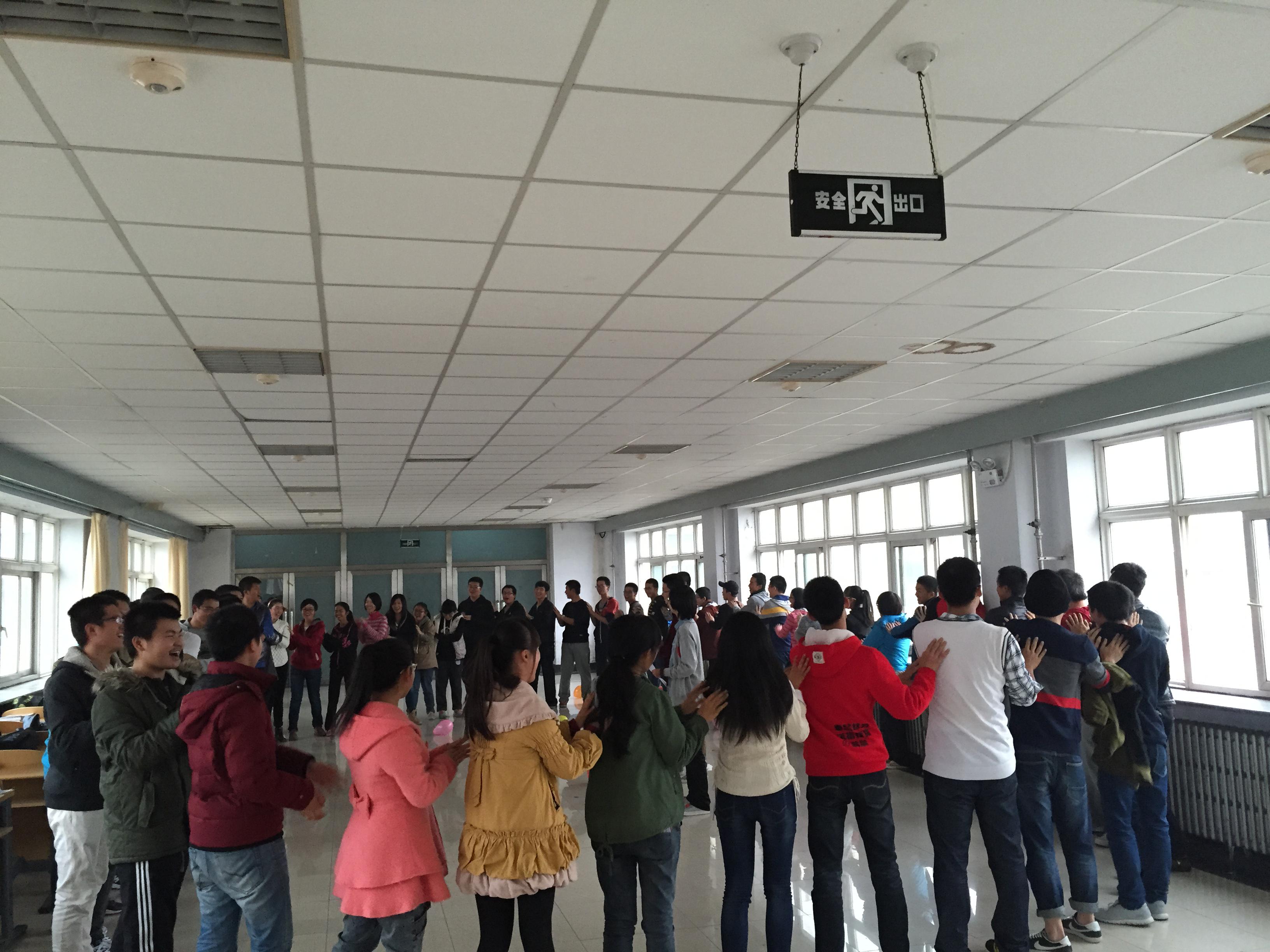 此次素质拓展活动采取“分组比赛、良性竞争”的比赛方式,由“你不知道的事”、“同舟共济”、“你是我的眼”、“背对背拥抱”四个环节组成。为了取得最后的胜利,各队团结协作,齐心协力,为了胜利奇招层出。在最为激烈的抢答部分,为了能抢到ABCD中正确的区域,大家都使出浑身解数,力争上游。虽然在活动过程中难免出现一定的身体碰撞,但这反而促进了同学之间的心灵沟通,增进了彼此的了解,使同学间的关系更加亲密。最为考验大家合作精神的是最后的“背对背拥抱”,每一个组的成员都要互相背对手挽手同时站起,为了让同时站起的人最多,每一个成员都在混乱中安定心神,集中注意力,虽然最后大家都精疲力竭,但却加深了每一位参与者对团结合作精神的认识以及对默契配合的理解。在每一轮比赛结束后,都别出心裁地设置了“惩罚”环节,如分数最低队伍的队员吃芥末同时对唱小苹果,用臀部写出“2014”等。活动在同学们的欢声笑语中圆满结束。最后,大家围成一个圈共同喊出“我们都是一家人”并拍照留念。