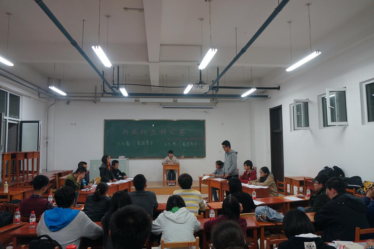 本场辩论赛于19:30正式拉开帷幕,分上下两个场次。首先登场两组的辩题是“豪门寒门易出贵子”,八位参赛辩手在赛前都为辩论赛做足了准备,他们反应敏捷,思路开阔,各展才能。双方的一辩滔滔不绝,慷慨陈词,详细阐述了本方观点,先从气势上压倒了对方。二、三辩选手机智灵活,才思敏捷,举例论证,将本方本方论据十分清晰地展现在大家的眼前。而在自由辩论的过程中,双方势均力敌,句句有力,字字在理,双方辩手慷慨激昂地表达、唇枪舌战地论述将本场辩论赛推向了高潮。最后,双方四辩用精彩的总结陈词为本场辩论画上了圆满的句号,台下也响起了热烈的掌声。第二场比赛同样精彩绝伦,网络热词“no zuo no die”成为辩论的焦点,双方辩手你来我往,针锋相对,表现的精彩纷呈,同样以来台下阵阵的掌声。两场比赛,评委们都做出了深刻的解读,并提出了意见与建议。