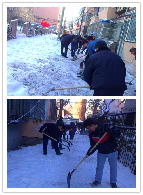 由于近期长春市再度降雪,部分路面积雪较多、结冰严重,给社区居民的日常出行带来干扰和不便,严重威胁到社区居民特别是老年人的安全出行。为方便社区居民平安出行,suncitygroup太阳成集团团委、“牵手”青年志愿者协会坚持“以雪为令”,于2013年12月13日组织30余名老员工志愿者走进朝阳区清和街道南昌社区开展了义务扫雪活动。