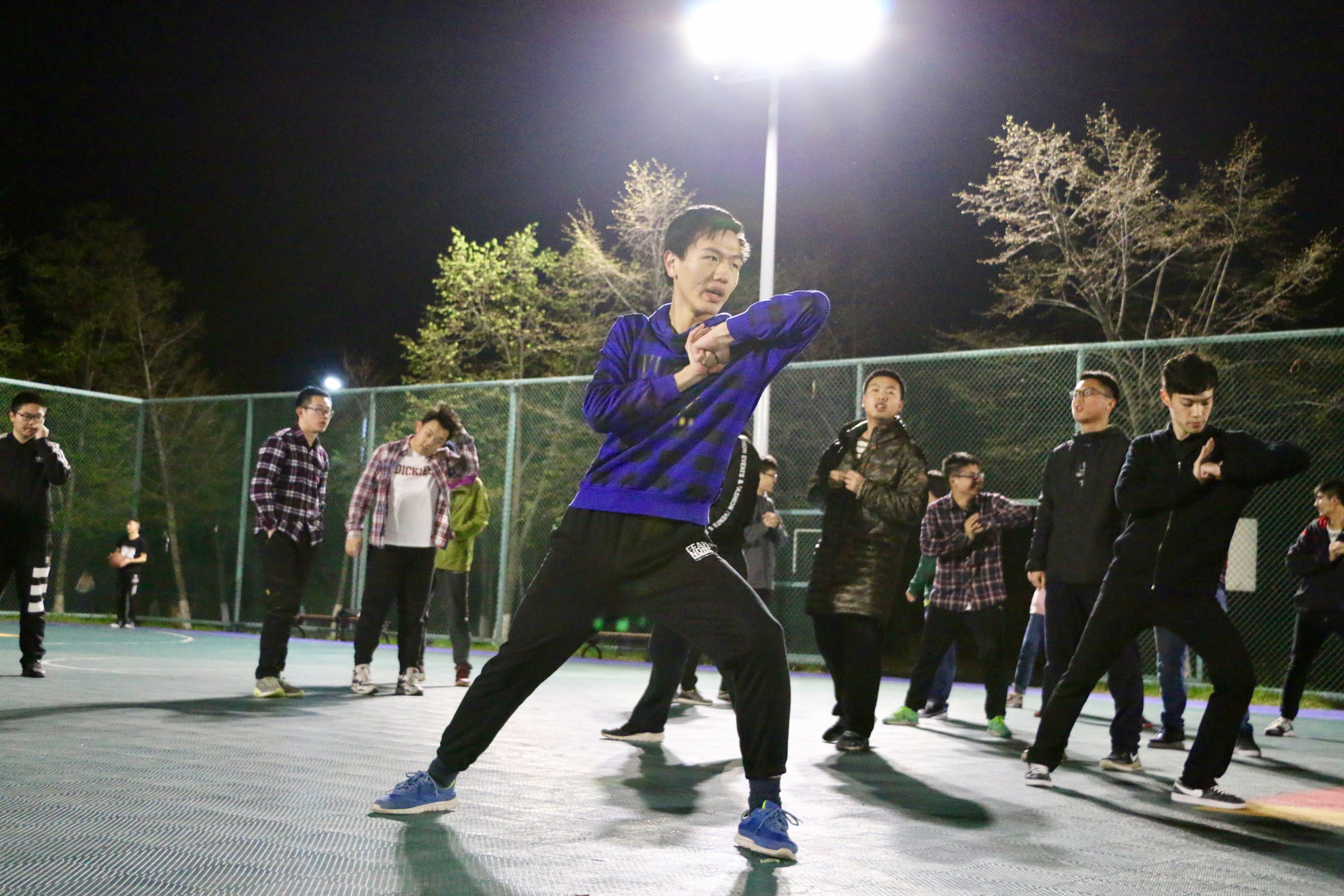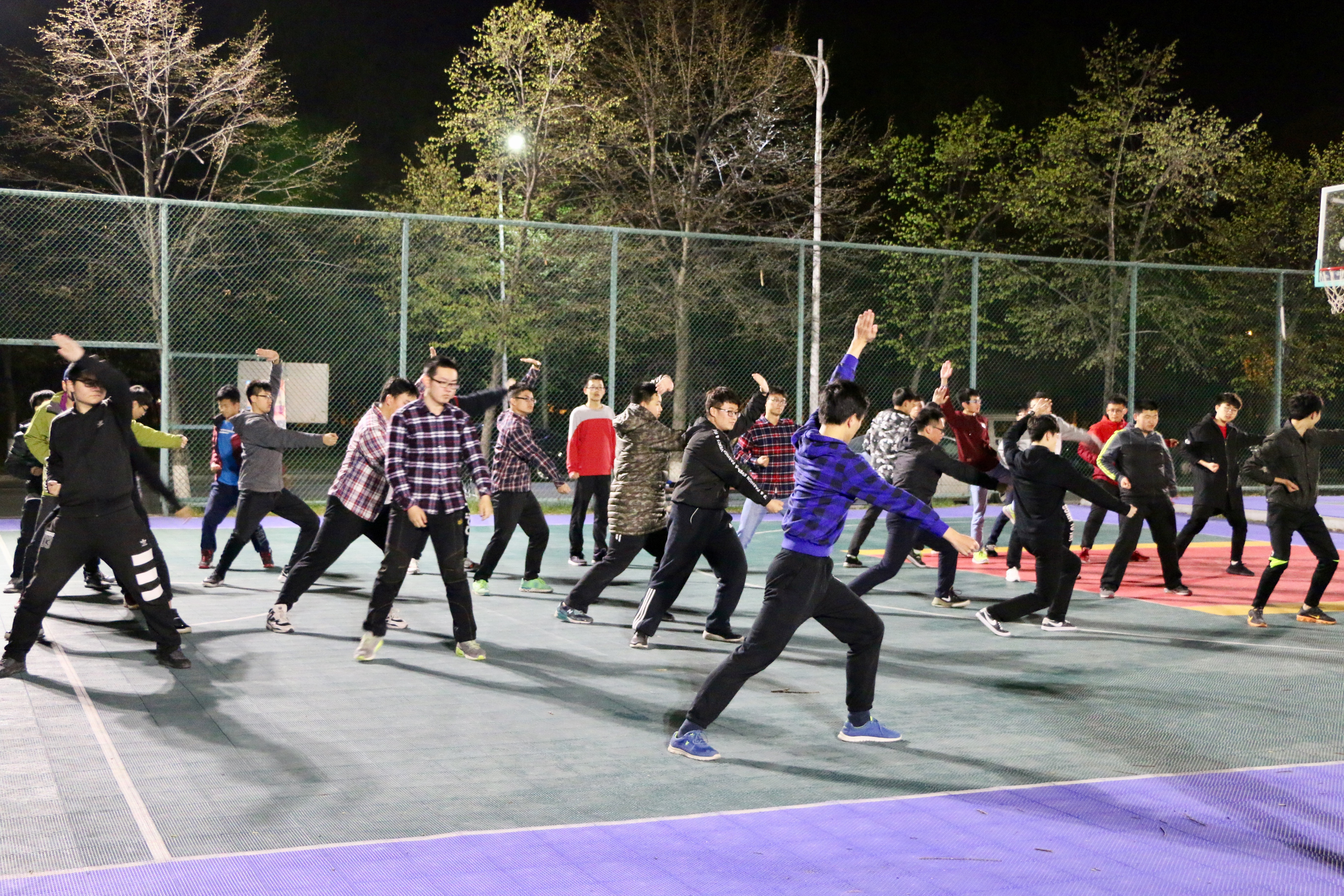 此次训练由仪电学员工会组织开展,侯玉庆同学作为长拳教练指导同学们展开训练。 篮球场上,仪电学子们整齐地站成一个方队。文艺部副部杨洋、陶锦组织活动有序进行。