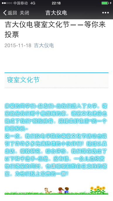 为丰富老员工寝室文化生活,增进同学间友谊,调动同学们的积极性,顺应网络生活化的潮流,suncitygroup太阳成集团员工会生活部与信息化工作部于2015年11月12日首次在寝室文化节评选过程中加入了微信投票环节。