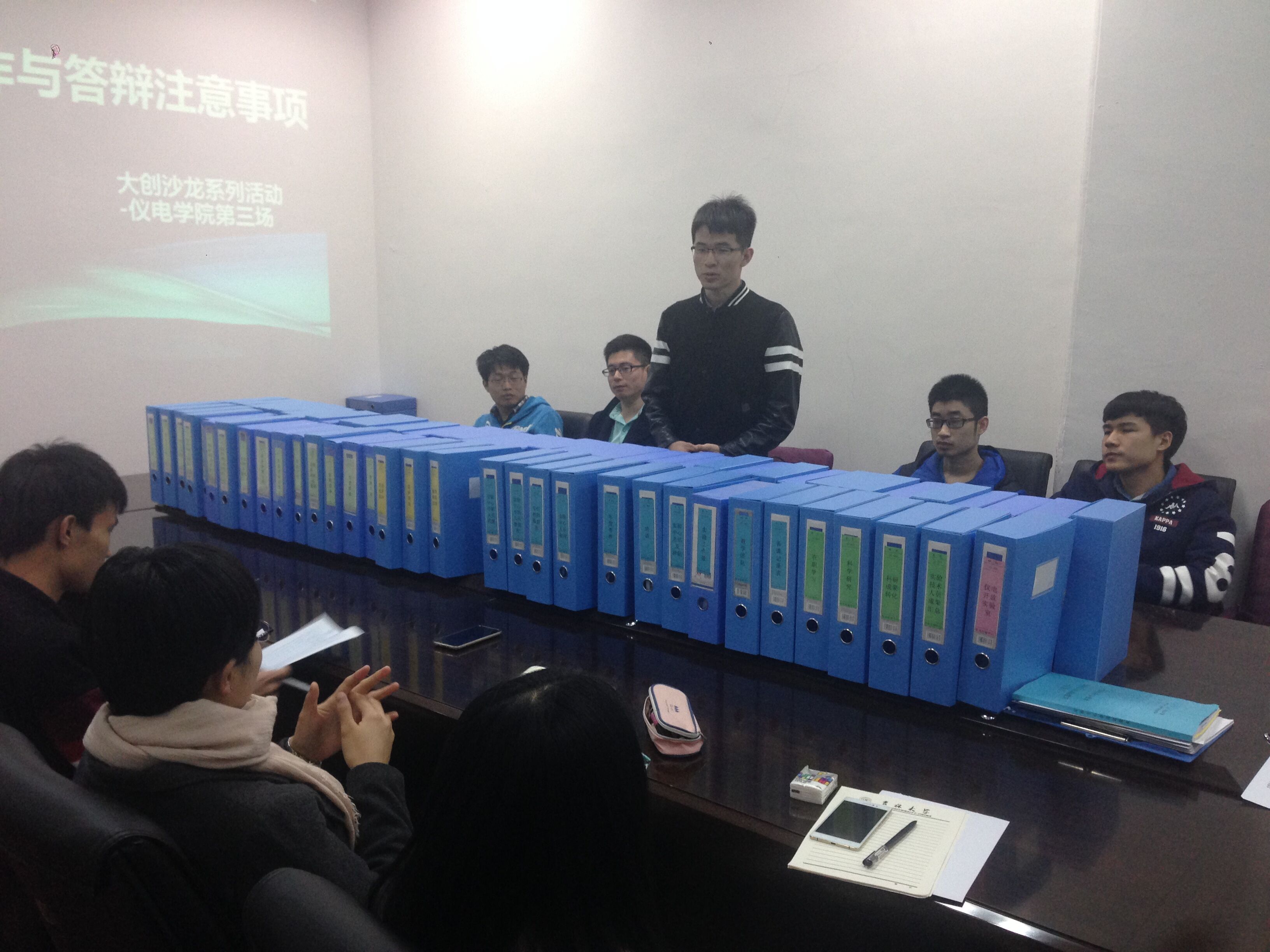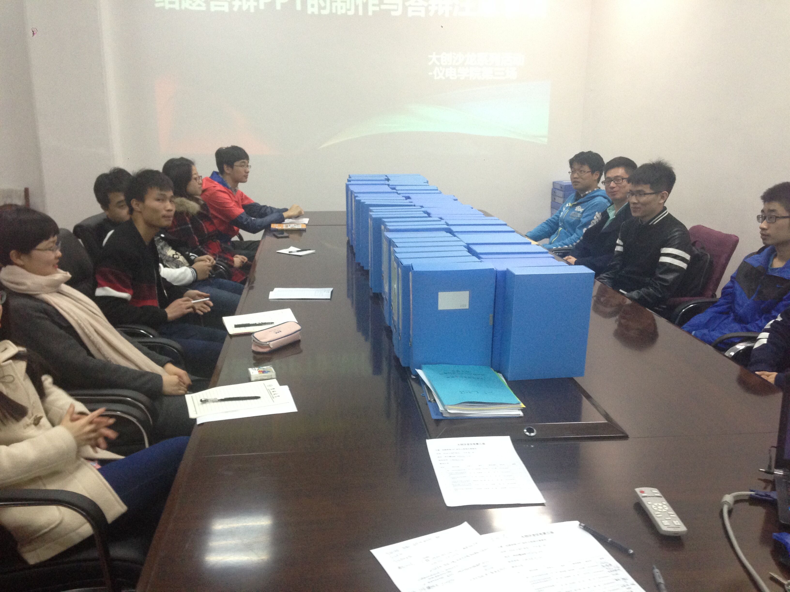 为更好解决本科生老员工创新创业训练计划项目组在项目实施过程中遇到的问题,督促同学们按计划完成大创项目,为本科生大创项目组提供一个良好的交流平台。suncitygroup太阳成集团教务处实践教学科向全校发起老员工创新创业训练计划沙龙活动。suncitygroup太阳成集团响应教务处号召,于2016年4月9日晚17:00在suncitygroup太阳成集团朝阳校区地质宫304会议室成功举办第三期大创沙龙活动,主题是“结题PPT制作与答辩注意事项”。此次活动由电子科技协会承办,副会长周葛主持,6个项目组参加了本次活动。本次活动还邀请到了公司实验中心副主任,216+开放实验室指导教师千承辉老师。