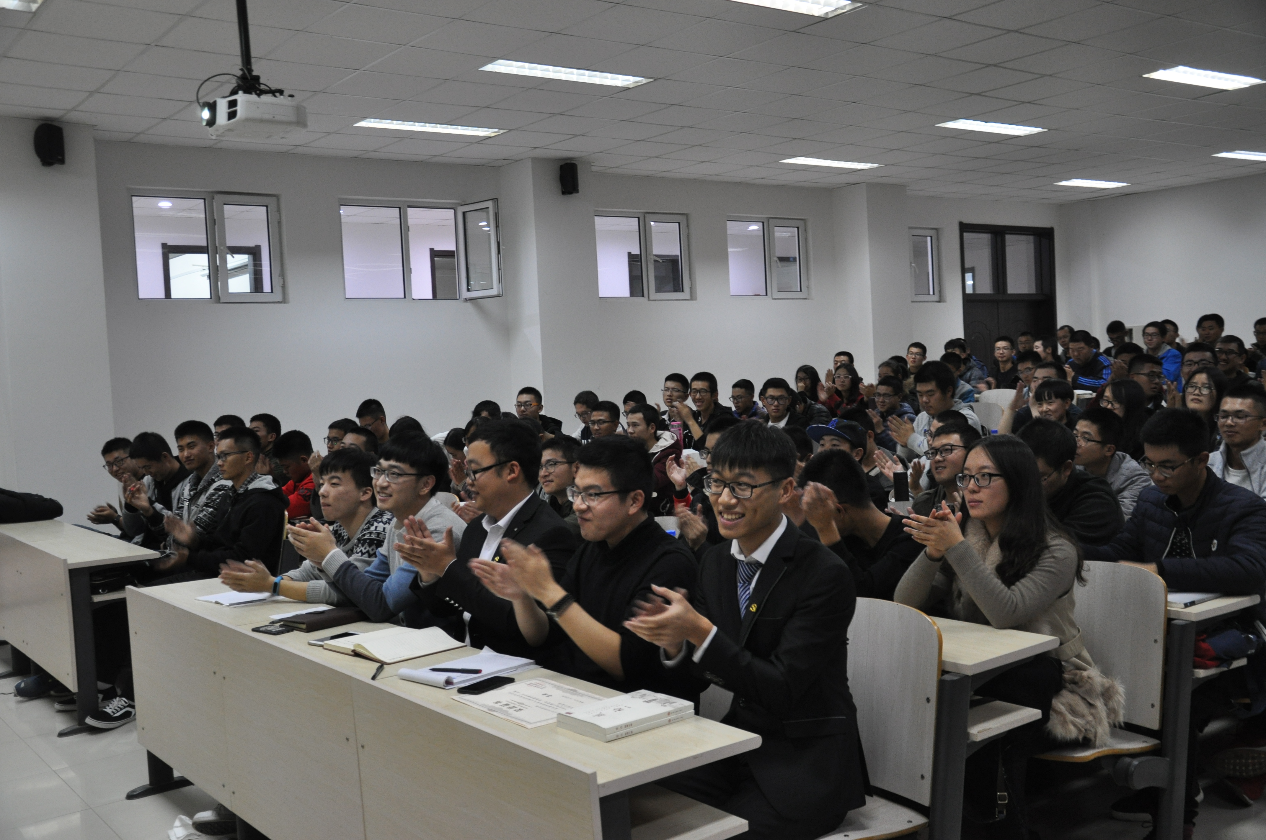 然后,主持人为同学们依次播放了新华网为迎接十九大制作的纪录片《领航》以及习近平同志在十九大报告中讲话的节选片段,同学们认真观看,不时颔首,倍感振奋。视频播放结束后,现场掌声雷动,不绝于耳,他们是在为日益强盛的祖国感到自豪,为能够处在这样一个伟大的新时代感到骄傲。