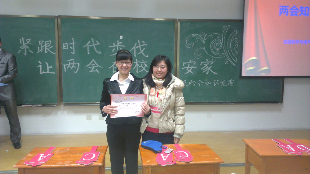 本次竞赛由两会宣传短片放映、必答题、抢答题、风险题﹑两会知识幻灯片展示﹑颁奖六个环节组成。整场比赛秩序井然、精彩纷呈,赛场内气氛庄重而热烈。同学们饶有兴趣地观看了纪录片,感慨于近几年中国的发展历程。纪录片放映结束后便立即进入必答题环节,已做好充分准备的各位选手满怀信心,沉着冷静,积极应答,大家的表现都非常优异。接下来是抢答题环节,考验知识素养的同时也要求选手有快速的反应能力。经过一番角逐,选手们尽展己能,不仅为班争光而且带领我们重温了祖国近年来艰难而光辉的历程。紧接着的风险题环节,新颖的比赛形式让现场气氛瞬时活跃起来,选手与搭档的默契配合,充分展现了同学间的凝聚力及创先争优的积极精神。比赛结束,经统计分数确定最终获奖情况,获得一等奖的班级为四班。分团委副书记李娇阳、员工会主席朴冠宇、生活部部长陈长松分别为选手颁奖并合影留念。在热烈的掌声中,本次两会知识竞赛圆满落下帷幕。