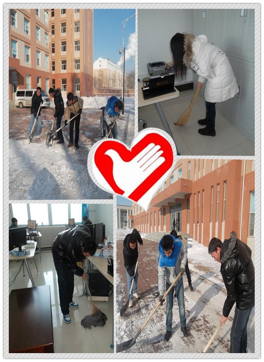 本次活动内容为:两部门2011级全体副部为中心校区基础园区一公寓和李四光教学楼门前清扫积雪和志愿者服务部2012级夏争辉、宁红扬两位志愿者同学为2012级新生辅导员打扫办公室两部分。12513:30社会实践部和志愿者服务部2011级全体副部长分别在李四光楼和基础园区一公寓门前集合,大家领取完扫雪工具后便立即开始了积雪清扫工作。由于条件的限制,公司配备的除雪工具仅仅是几把铁锹,加上五六级的寒风和零下二十度的寒冷气温,使除雪工作更加艰难。一开始,志愿者们脸和手脚都冻得通红,嘴里呼出的热气一下子就凝成了水雾,可是大家仍发扬吃苦耐劳、顽强拼搏的精神,团结协作,顶着寒风,咬牙坚持,将宿舍楼和教学楼外的积雪清扫干净。他们热火朝天、干劲十足的扫雪身影也感染了路过的同学,大家纷纷表示赞许。经过一个小时的奋战,此次扫雪任务圆满完成,虽然室外气温很低,但是大家劳动的热情,团结的力量让这个冬日变得格外灿烂和温暖。与此同时,志愿服务部2012级两名同学准时来到李四光楼203辅导员办公室,帮助新生辅导员蔡印老师打扫办公室。他们两位合理分工,埋头苦干,拿起抹布、笤帚等清洁工具对办公室的门窗、地面、桌椅、墙角等卫生死角进行了全面彻底的打扫和清理,活动过程中,他们不怕苦、不怕累,经过一个小时的劳动,顺利完成了大扫除任务,使办公室整洁卫生、焕然一新,两位同学的辛勤劳动也获得了大一导员蔡印老师的高度认可和鼓励。