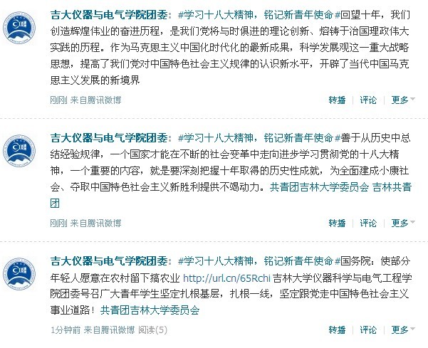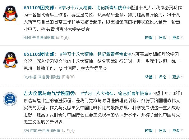 公司团委号召各班级团支部要高度重视并把学习宣传贯彻党的十八大精神作为当前和今后一个时期的首要政治任务,把这项工作摆在突出位置,集中力量,抓好落实,大力创新活动形式和载体,力求贴近员工的思维方式和认知习惯,不断积极创新总结,扎实推进微博学议十八大活动,不断掀起学习宣传贯彻十八大精神的新高潮!