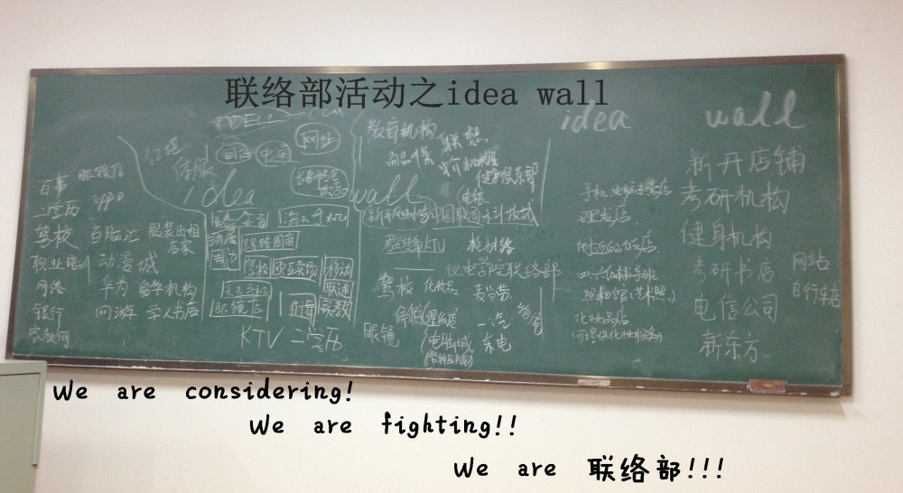 在部长马晶同学真挚温馨的开场白后,会议正式开始。首先,马晶同学向同学们讲述了外联工作的详细流程以及各种注意事项。接着,部员们被分成四个小组,并得到了各自下一阶段的任务。而后,部长马晶与大家分享了外联经验与收获,并在提问环节让大家交流讨论,将各自的想法写在“idea wall”上,现场气氛十分活跃。最后马晶部长对各位部员提出了建议,希望部员在外联工作过程中要谨慎小心,谨防受骗,应提前与赞助方签订合同,在活动结束后要及时与赞助商进行沟通反馈,为今后更好的合作奠定基础。