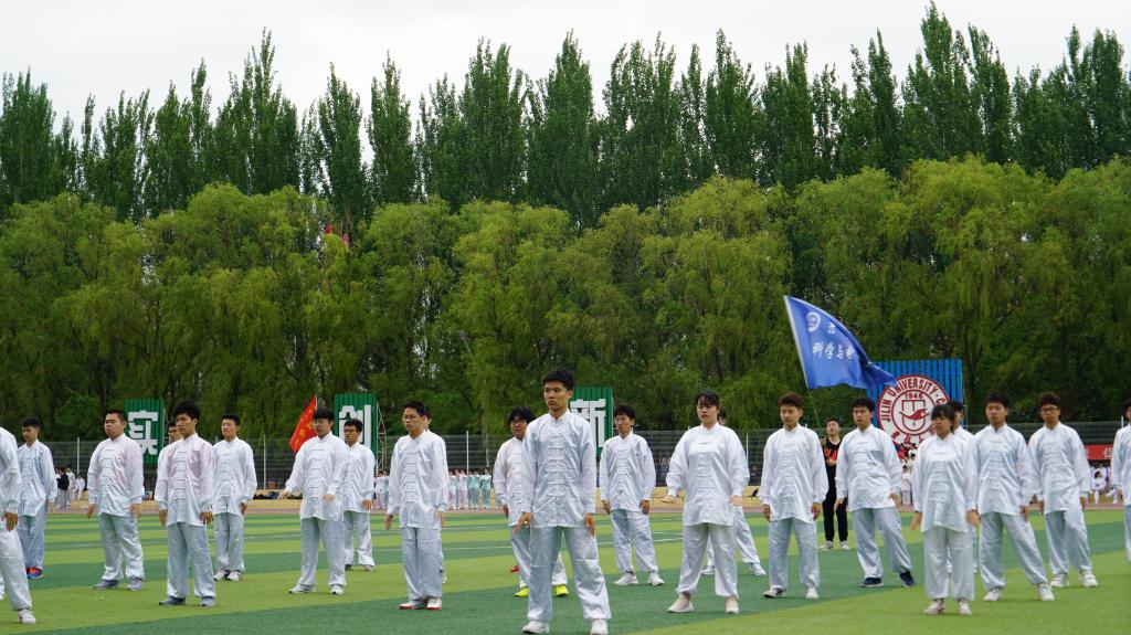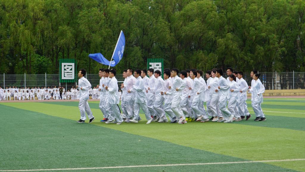 经过为期两周的培训,同学们已经能够完整熟练地完成整套太极拳,准备迎接比赛的到来。上午8:00,队员们在体育场内集合,回忆比赛流程和动作要领,做好赛前准备。仪电公司太极方队由32名队员和一名旗手组成,随着入场口令的下达,方队踏着整齐的步伐,喊着响亮的口号进入场地中央。在舒缓的音乐中,同学们动作舒展大气,节奏稳健,队伍整齐划一,充分展现了太极的柔和之美。