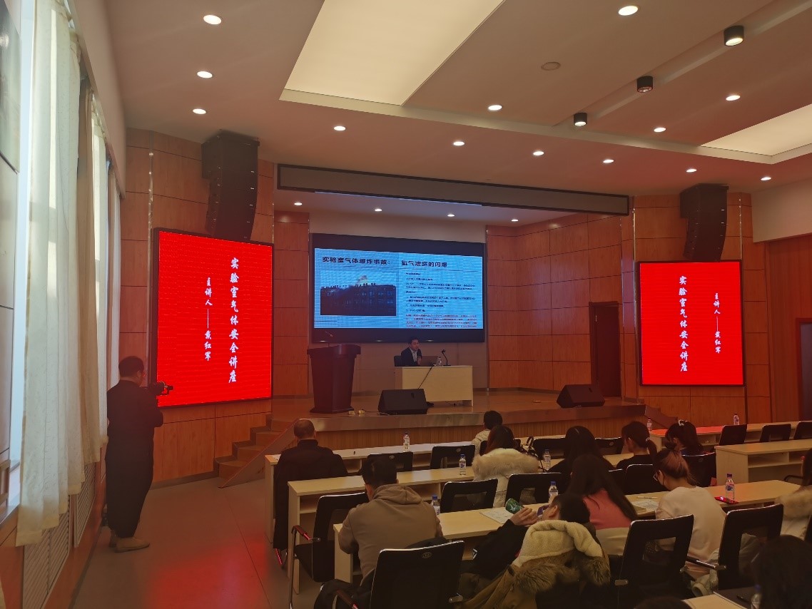 讲座的第一部分为化学类实验室安全讲座,由公司化学公司副经理张贺主讲,张贺结合多起由危险化学品引发事故的典型案例,深入分析了实验室用电、用火、危险化学试剂管理等方面可能存在的潜在危险,为参会师生树立了预防为主、未雨绸缪的指导思想。讲座第二部分由广州德标智能化工程有限公司的戴红军主讲,戴红军以《实验室气体安全讲座》为题,重点介绍了有毒气体、易燃易爆气体、惰性气体等可能造成的危害,并对高校实验室气体钢瓶的常见隐患进行了分析。讲座第三部分由长春奥狮环境监测有限公司的刘宇臣主讲,讲座内容包括电离辐射的类型、电离辐射的危害、电离辐射的防护等方面知识。