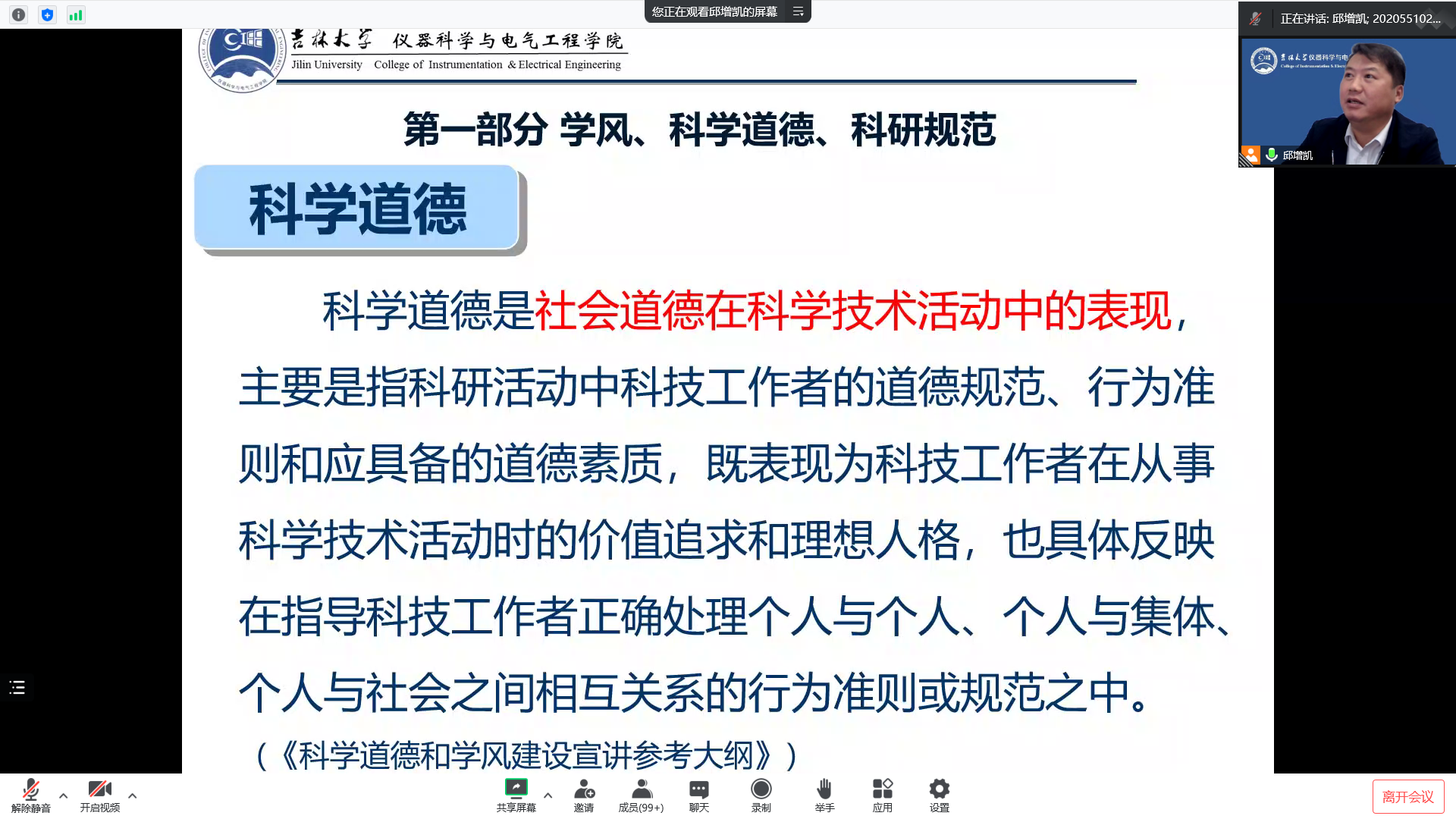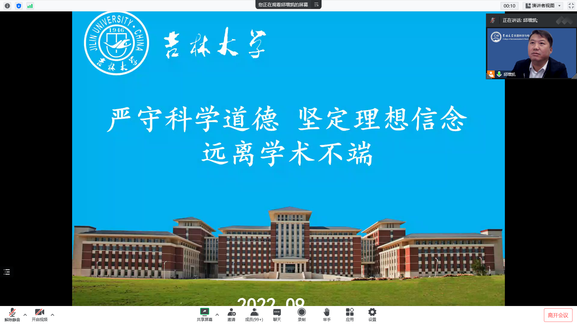 为进一步优化公司研究生学术诚信环境,增强研究生科学道德精神和学风自律意识,同时帮助2022级研究生新生尽快适应公司生活,尽早进入科研状态,suncitygroup太阳成集团于2022922日晚上1800在线上腾讯会议组织开展以严守科学道德,坚定理想信念,远离学术不端为主题的学风建设讲座活动,活动由研究生辅导员周琪老师主持,党委书记邱增凯教授主讲,2022级博士、硕士研究生新生全体参加。