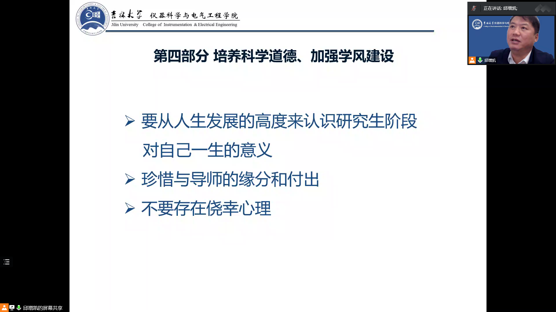 讲座最后,邱增凯教授强调,要从人生发展的高度来认识研究生阶段对自己一生的意义,要珍惜与导师的缘分和付出,不要存在侥幸心理。希望全体研究生新生要有一种时代使命和责任担当,刻苦钻研、积极探索、勇于创新,要以推动团队建设和挖掘世间真理为己任,共同营造求真务实、潜心研究、诚信严谨的学术风气。