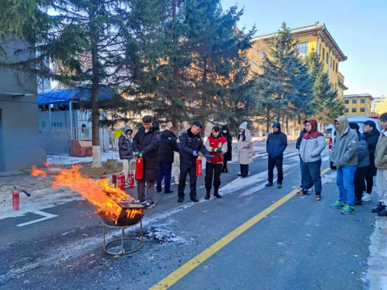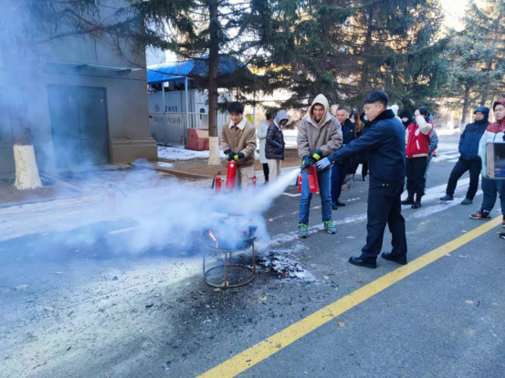消防安全教育培训后,与会人员参加了灭火演练活动,唐小兵还为师生们讲解并演示了不同类型的灭火器使用方法及注意事项,现场师生积极进行了灭火演练。