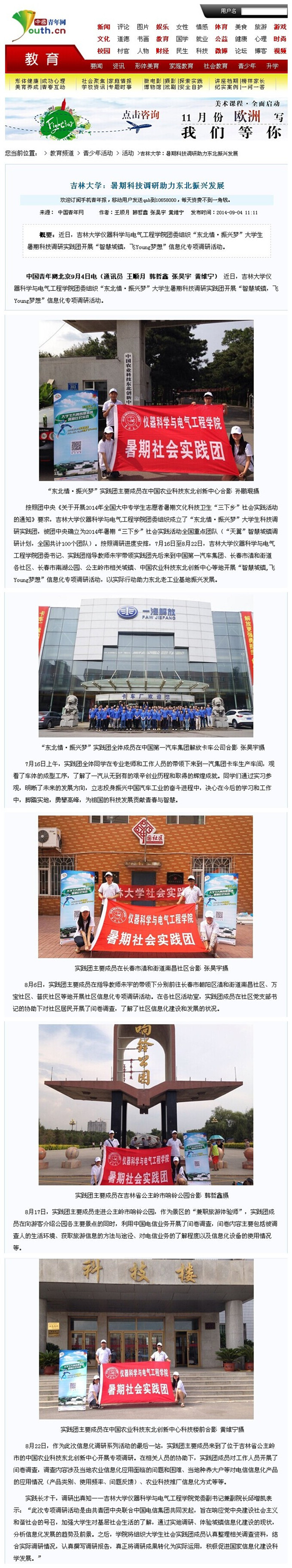 中国青年网由共青团中央主办,是国内最大的青年主流网站,也是全国大中专员工暑期“三下乡”社会实践活动官方网站。此次报道是继2014年7月11日中国青年网以《“东北情·振兴梦”吉大学子暑期科技调研实践》报道公司2014年暑期“三下乡”社会实践活动后再次对公司老员工社会实践活动进行报道至此公司也成为2014年暑期“三下乡”社会实践活动中唯一一个连续两次受到中国青年网关注报道的基层公司。