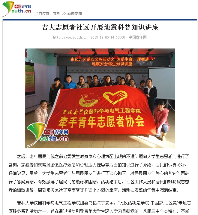 1、中国青年网《吉大志愿者社区开展地震科普知识讲座》