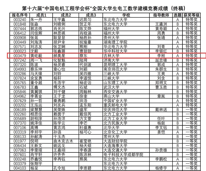 图5 第十六届电工杯数学建模竞赛获奖名单(部分)