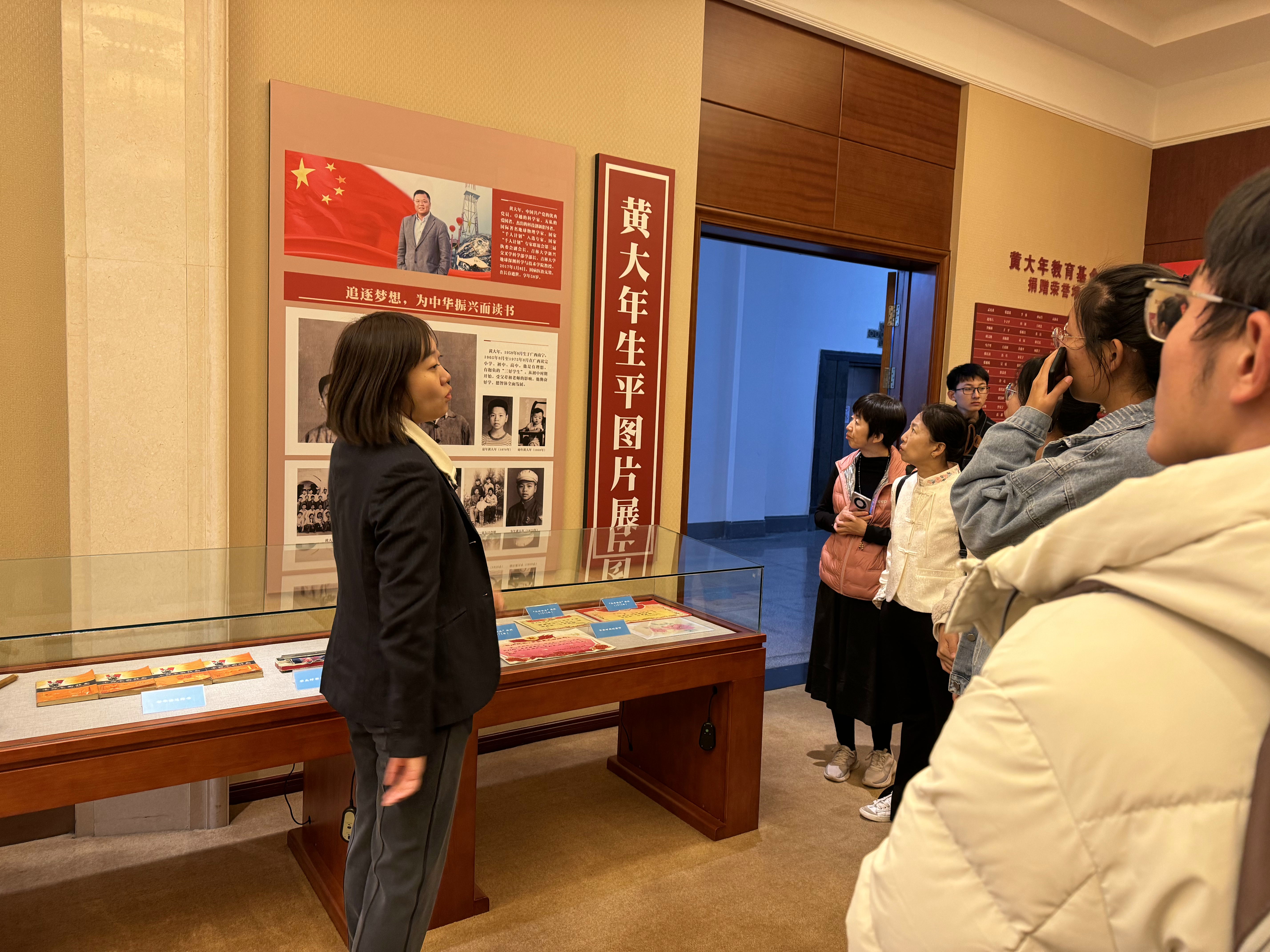 步入纪念馆,庄严肃穆的氛围瞬间将同学们带入了一个充满敬意与感动的空间。纪念馆内,一幅幅珍贵的照片、一件件饱含故事的展品,以及工作人员深情并茂的讲解,生动再现了黄大年教授感人至深的先进事迹。从他对科研的执着追求,到对国家的深情厚谊,再到对员工的无私奉献,每一个细节都深深触动着在场每一位同学的心弦,让大家深刻感受到了黄大年教授高尚的爱国情怀、敬业精神与卓越的科学素养。