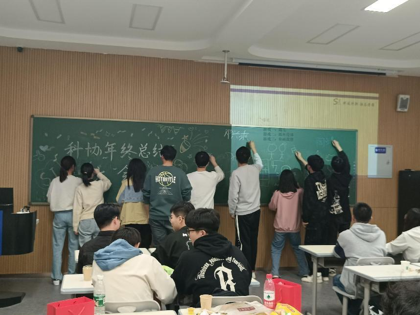 首先,会长向大家介绍了科协的基本情况和进程,使社团成员们再次了解社团的同时,也进一步增强了大家的归属感。接着,会长向大家展示了科协一年来举行的各项活动和成果,如保研/电赛分享会、华为高校行、文化驿站等,同时对下一年度的各项工作提出了期望。随后,为社团努力工作了一年的部长和优秀成员们,颁发了精美的礼品并合影留念。接下来,刘梦爽学姐组织大家进行了“敲7”“纸杯弹珠”“你画我猜”的趣味游戏,做到了全员参与,通过分组积分的形式比拼,还有的成员接受“惩罚”,上台讲述趣事,大家在欢声笑语中增进了彼此间的友谊,也无疑加深了成员间的了解与交流。最后,每位成员在黑板上签下了自己的名字,绘成了属于科协的独家记忆。