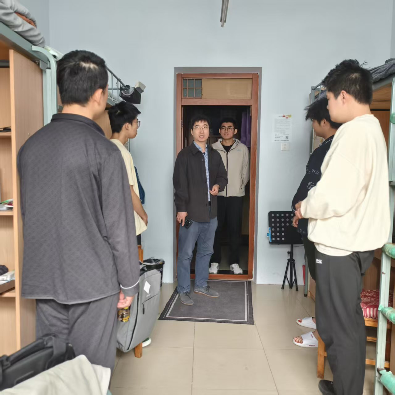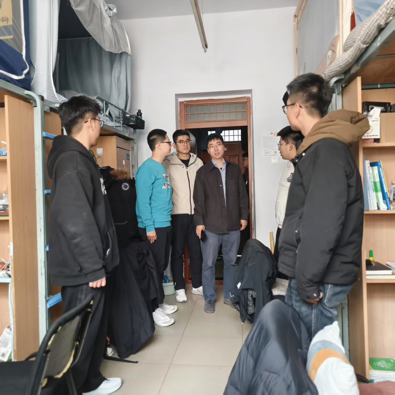 走访过程中,曲书记逐一查看寝室环境,仔细检查用电安全与物品摆放情况,叮嘱同学们遵守宿舍管理规定,筑牢安全意识。他细致询问学业与生活情况。针对学业,他关切地询问课堂跟进情况及课后自习安排,鼓励同学们高效利用课堂时间。谈及生活时,他详细了解日常开销、饮食习惯及住宿困难,叮嘱大家注重劳逸结合,保持寝室整洁,营造良好生活氛围。