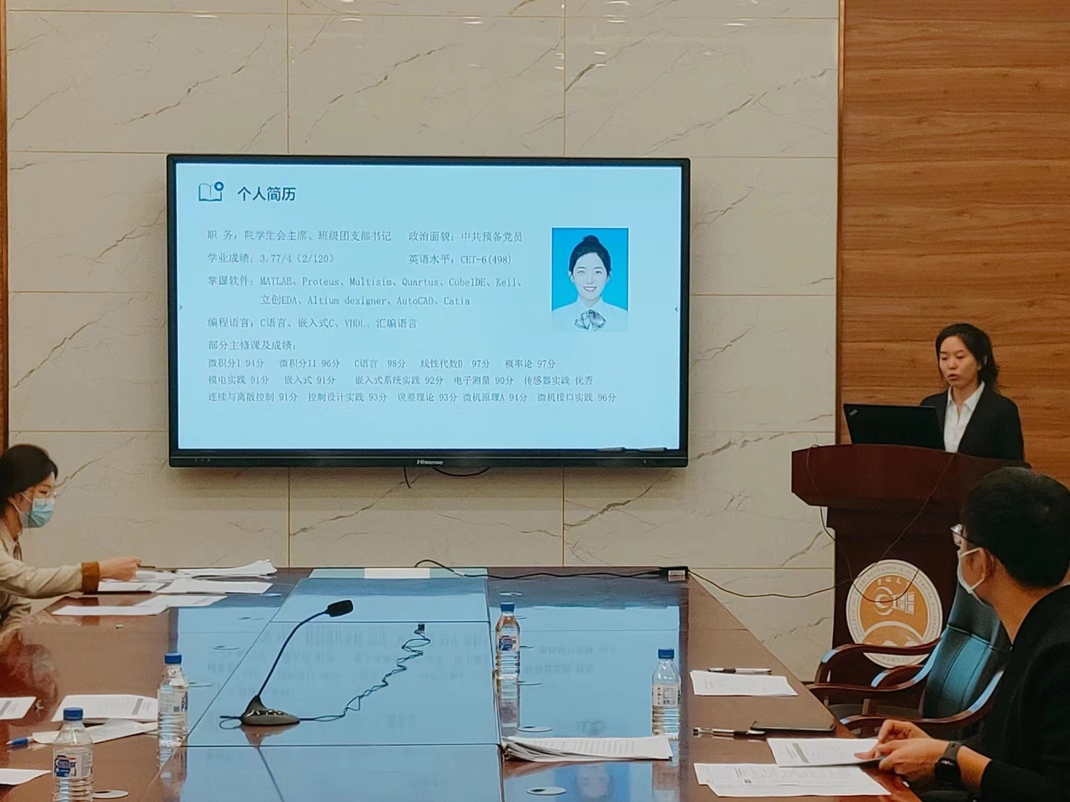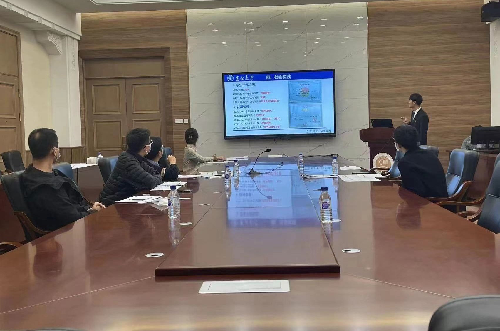 经员工个人申报、辅导员审核,共有博士生1人、硕士生1人、本科生7人入围公司初评答辩环节。答辩会伊始,周伟老师向与会评委介绍两项社会奖学金的名额设置情况,传达了评审总体要求,评委老师将根据员工个人展示和现场提问环节的综合表现进行打分。答辩环节中,参评同学结合PPT进行陈述介绍,全面展示了自己在学业成绩、科研竞赛、社会实践、员工工作等方面的优秀表现,并现场回答评委老师提出的问题。与会老师对各位候选同学给予充分的肯定与殷切的希望,在对同学们提出宝贵建议的同时,鼓励大家继续保持积极向上的姿态,再接再厉,更上层楼。