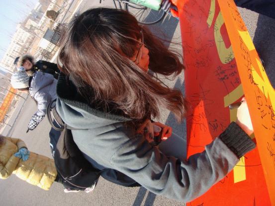 本次活动以“忆往昔峥嵘岁月,扬学子爱国情怀”为主题,活动从早上10点开始,虽然室外已经是零下十几度的气温,但在活动现场,员工会负责成员铺展开醒目的条幅,吸引了过往同学驻足关注。在现场工作人员热情的邀请与号召中,广大同学踊跃参与、积极配合,纷纷在条幅上签下自己的姓名和激昂的话语,抒发自己对于革命先驱的缅怀之情,并表示将永远铭记“一二•九”这一伟大的员工爱国运动,立志将爱国精神代代相传。活动持续到了当天下午2点,在活动结束时宣传条幅上已密密麻麻地布满同学们的名字和爱国标语。